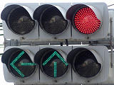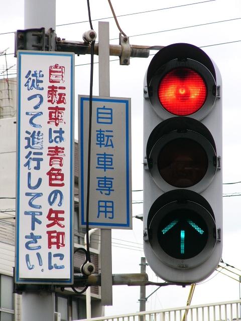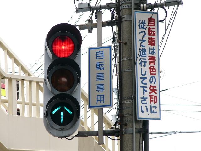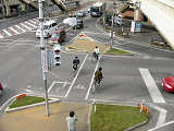 6差路で、交通島(縁石で区分された島状の施設)が5箇所、自転車横断帯が11本もある複雑な交差点です。そのうち2本の自転車横断帯に矢印組込み灯器が設置されています。
