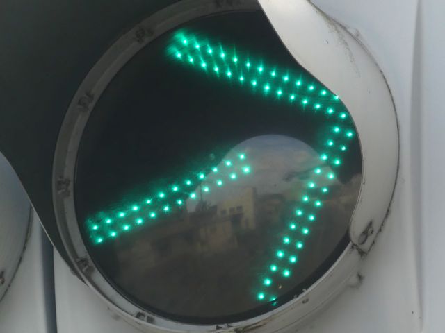 通常の十字路ですが、なぜか右折の矢印が斜め上向きになっています。