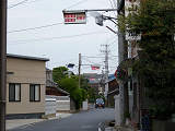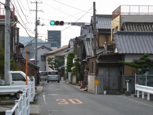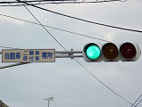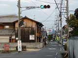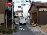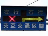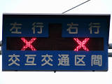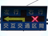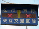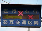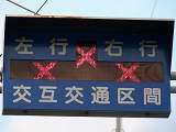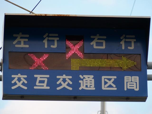約450mの区間が信号による交互通行となっています(路線バスの通行あり)。区間内には何箇所か交差点があり、交互通行となっている側(優先道路側)には、「交差点・対向車注意」と表示される標示板が設置され、交差道路側には、進行しやすい方向を示す標示板が設置されています。