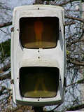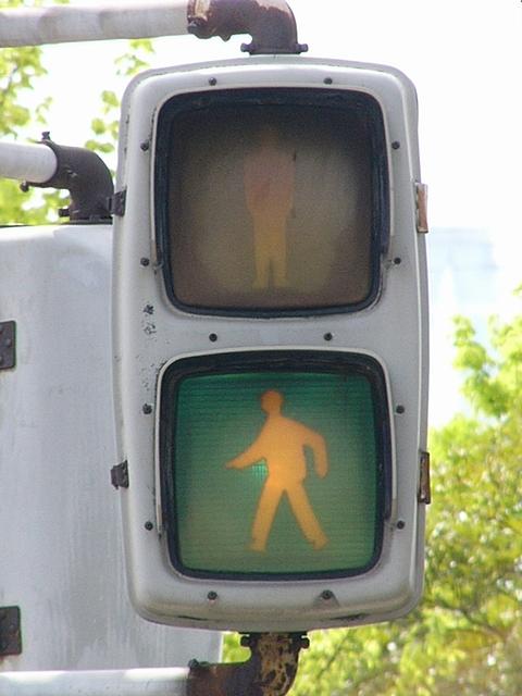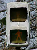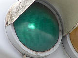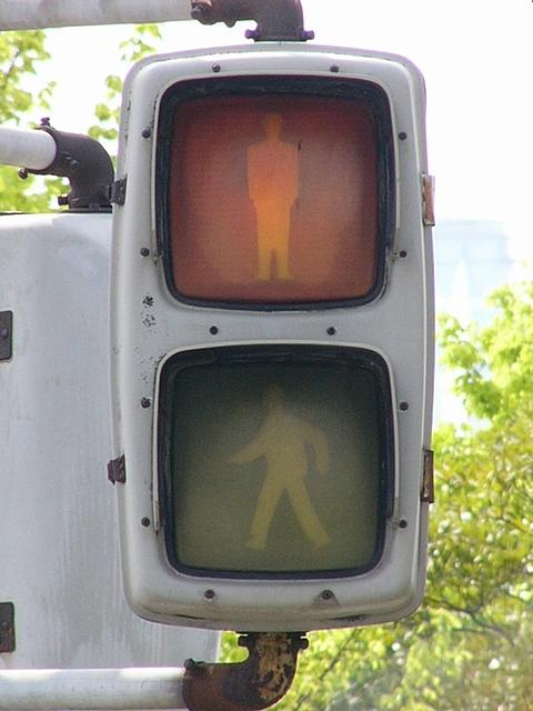 松下通信工業(当時)製の初期の樹脂製歩行者用灯器です。レンズの周りに14箇所のネジ止めがあります。上の灯器よりも新しい世代です。