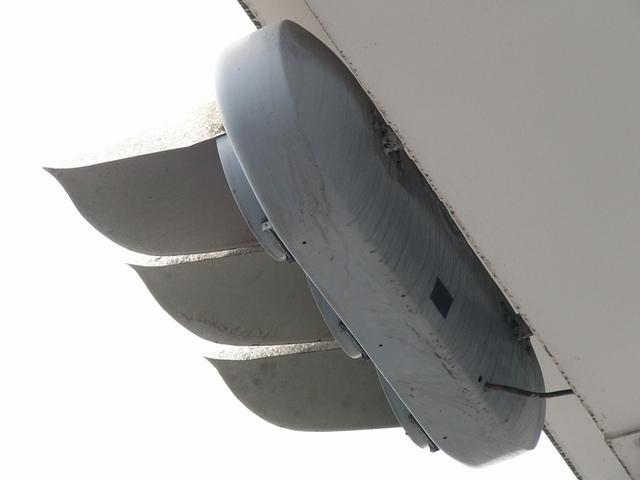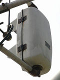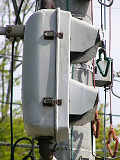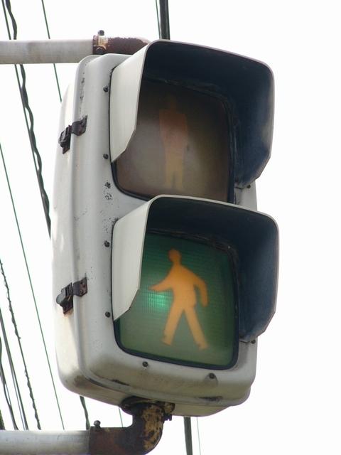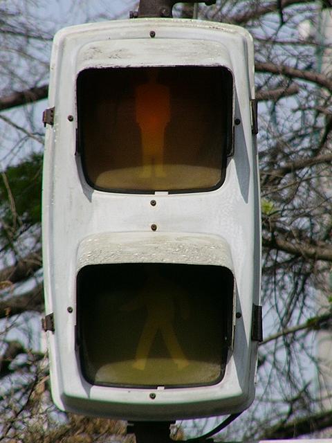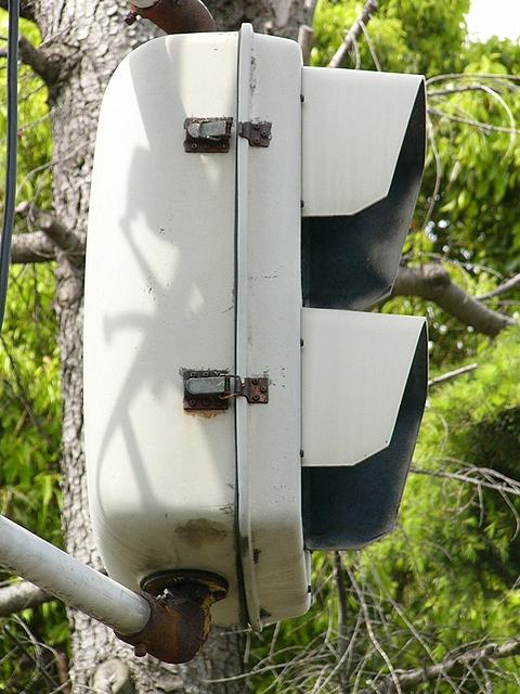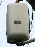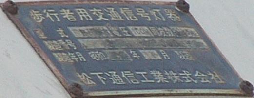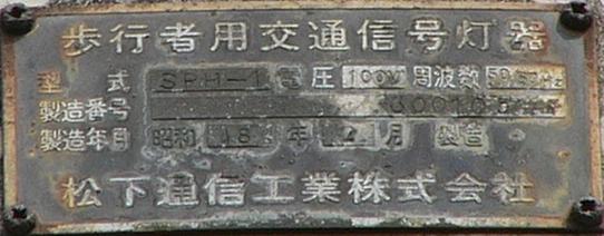 松下通信工業(当時)製の初期の樹脂製歩行者用灯器です。レンズの周りの8つのネジ止め、レンズの間隔が広い、フードがかなり下向きなどの特徴があります。レンズの間隔が広いということで、その分、灯器自体も縦長な気がします。フードが下向きのため灯火面の上5分の1ほどが隠れてしまっています。現在は撤去されています。