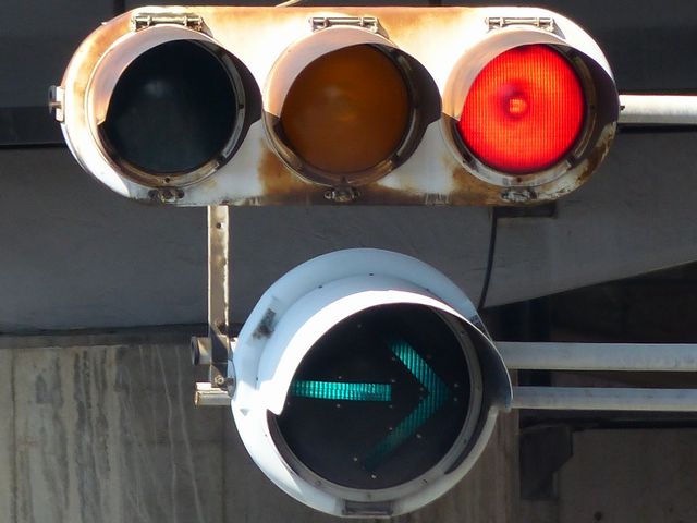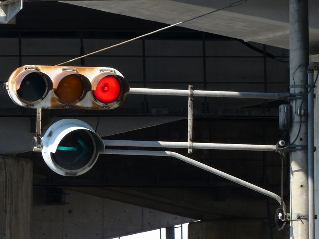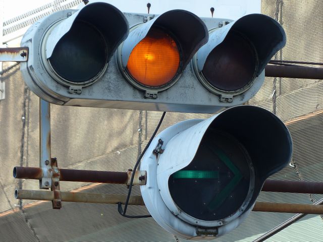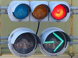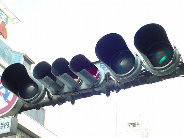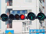 車線数の多い道路で矢印信号を目立たせるため、交差点手前右補助灯器の矢印灯器のみ450φ灯器を使用しています。上段のものの方が古く、矢印のマスクをレンズにビス止めしているのが分かります。