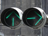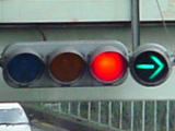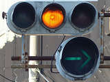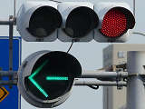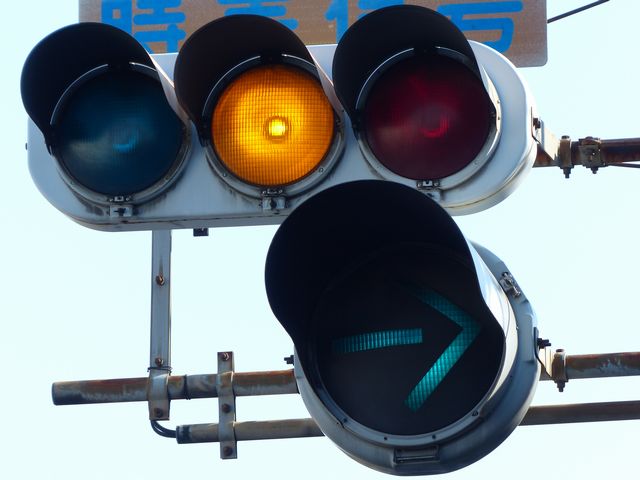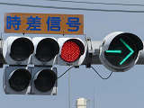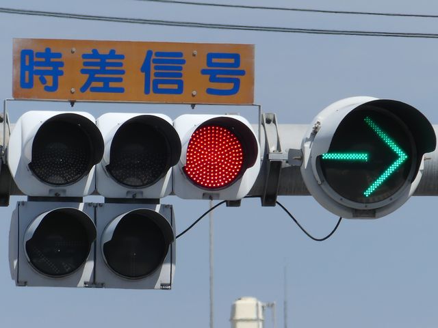 大きな交差点で右折矢印信号を目立たせるため、主灯器の右折矢印灯器のみ450φ灯器を使用しています。本灯器の下に450φ矢印灯器を設置した場合、高さ基準を満たさなくなるためか、本灯器の右側に矢印灯器を設置しています。