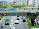 車線数の多い道路で灯器を目立たせるため、中央分離帯設置の灯器のみ450φ灯器を使用しています。