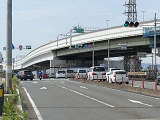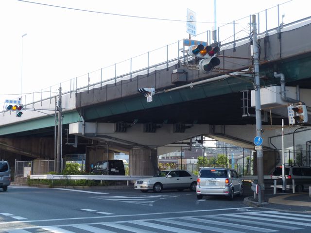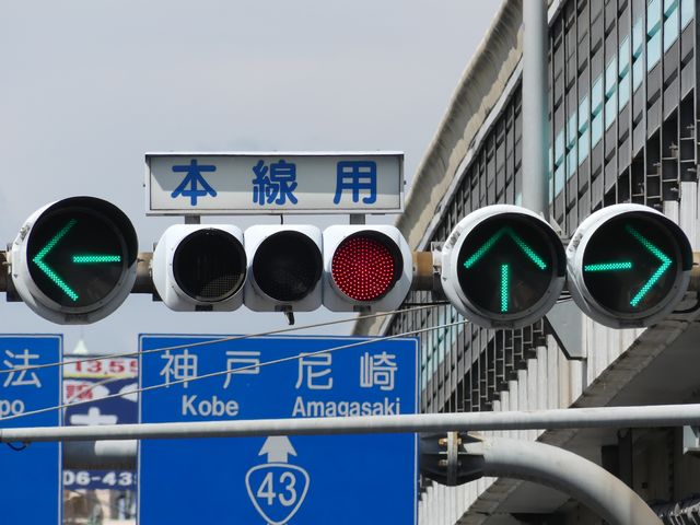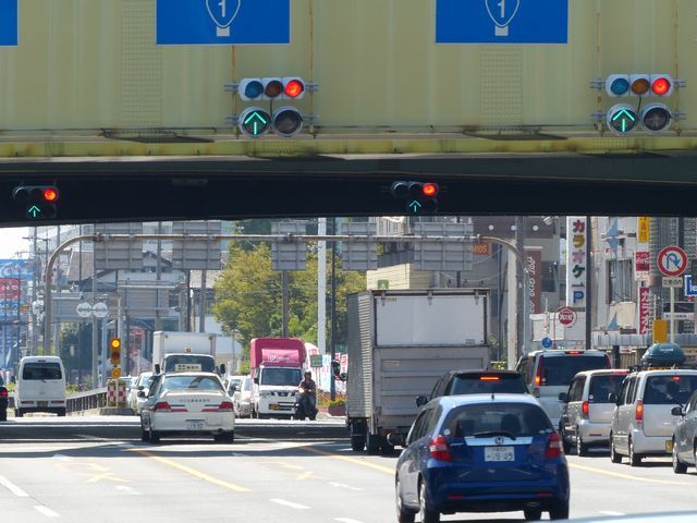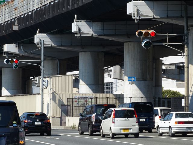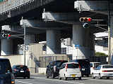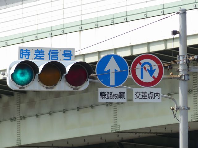 車線数が多い一方通行路に右から高速道路出口が合流する交差点です。交差点内にも車両通行帯が続いていて交差点であることが分かりにくいため、450φ灯器を使用して灯器を目立たせているようです。