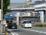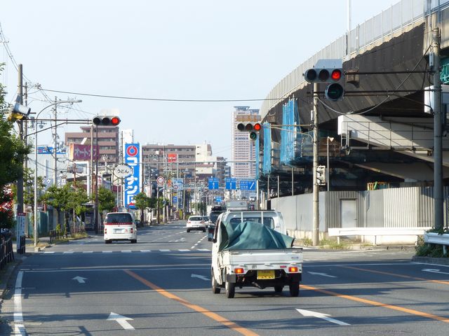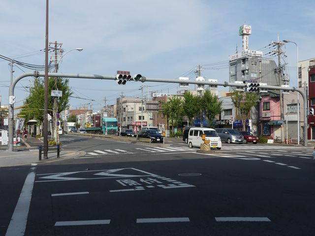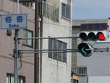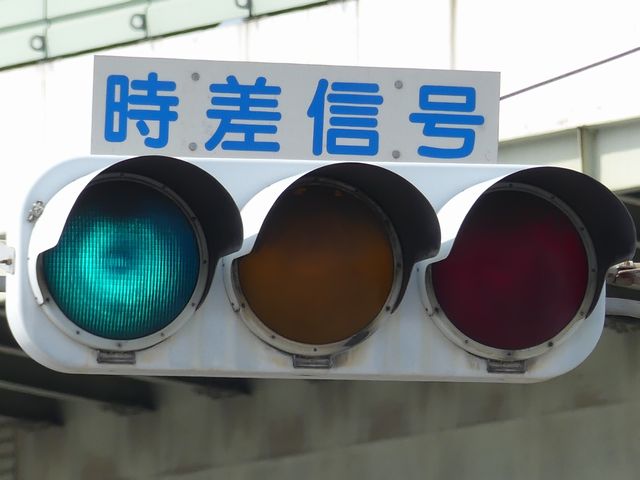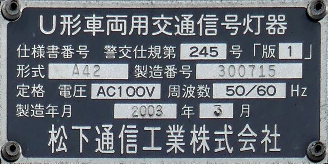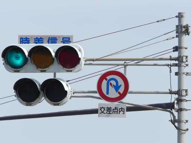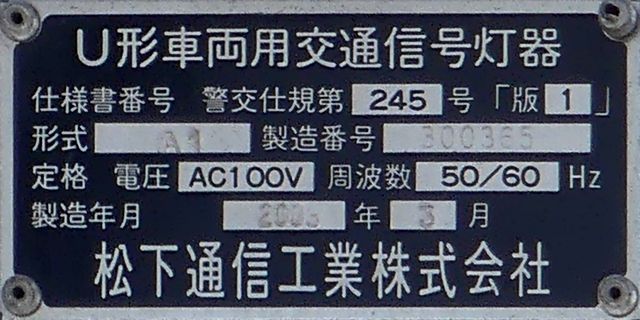 連続交差点の手前側交差点で灯器を目立たせるため、主灯器の本灯器のみ450φ灯器を使用していました。なお、樹脂製でLED式の矢印灯器は、銘板にラベル(ガムテープ)が貼られていました。