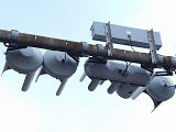 車線数の多い道路で矢印信号を目立たせるため、交差点手前右補助灯器の矢印灯器のみ450φ灯器を使用しています。矢印のマスクをレンズにビス止めしているのが分かります。