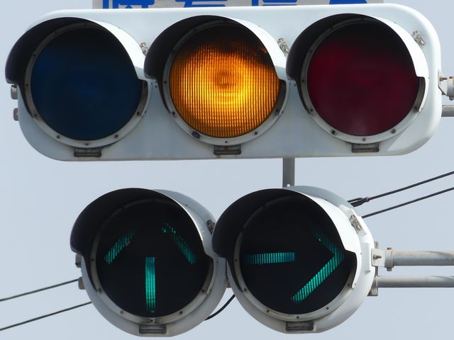 大きな交差点で矢印信号を目立たせるため、主灯器の矢印灯器のみ450φ灯器を使用しています。本灯器の下に450φ矢印灯器を設置した場合、高さ基準を満たさなくなるためか、本灯器の両脇に矢印灯器を設置しています。