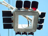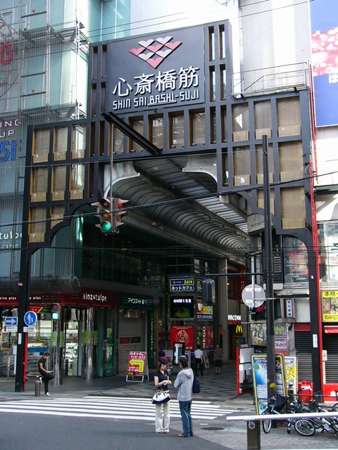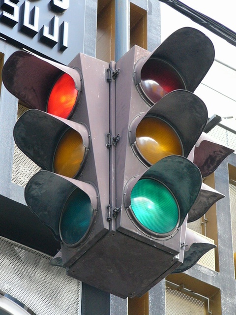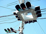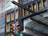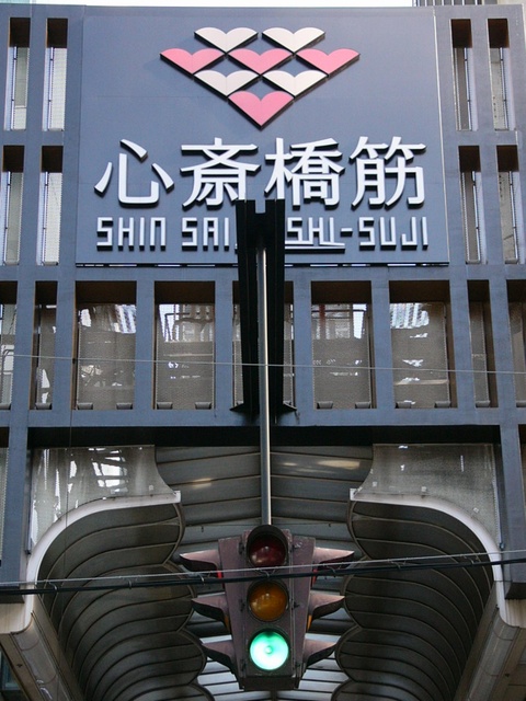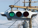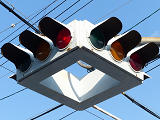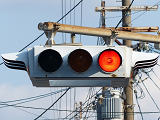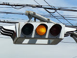 大阪ミナミの戎橋北詰の小さな交差点にある一体型車両用灯器です。繁華街中心部の観光スポットであり、景観に配慮してこの灯器を採用したのでしょう。アーケードから延ばされたアームに吊り下げられています。