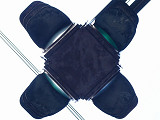 狭い交差点で信号柱を立てる十分な場所を確保できないためか、4方向の車両用灯器が一体となった灯器が交差点中央に設置されています。通常であれば4方向一体型車両用灯器1台ですべての交通の交通整理をこなしますが、この交差点は東西の道路がずれた食い違い形交差点のため、通常のの3色灯器を1台追加して対応しています。なぜか西側のフードのみ長くなっています。