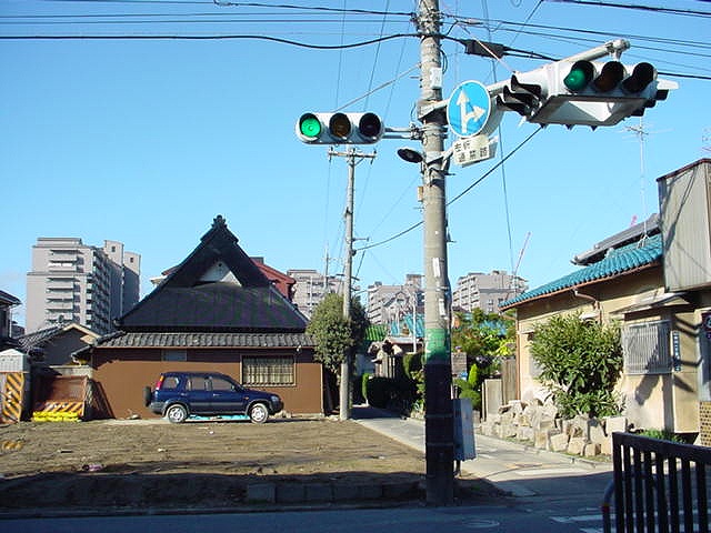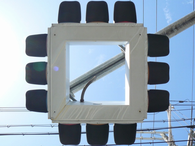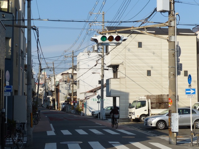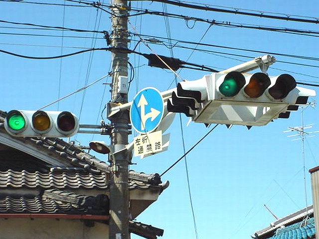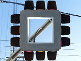 狭い交差点で信号柱を立てる十分な場所を確保できないためか、4方向の車両用灯器が一体となった灯器が交差点中央に設置されています。