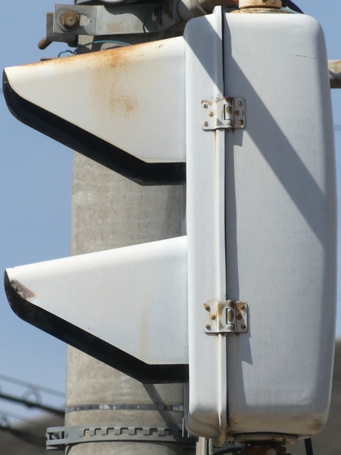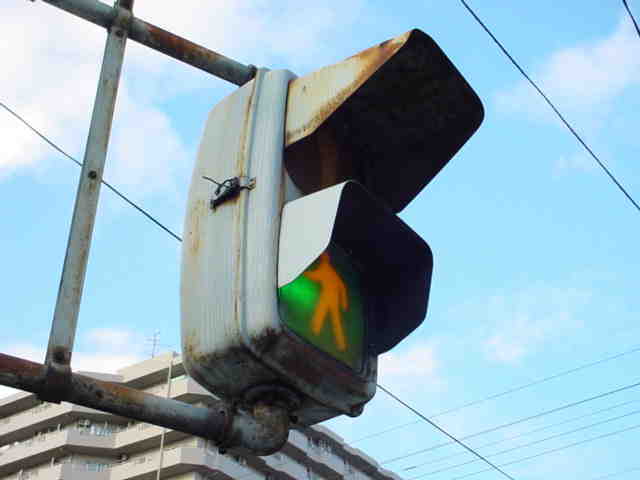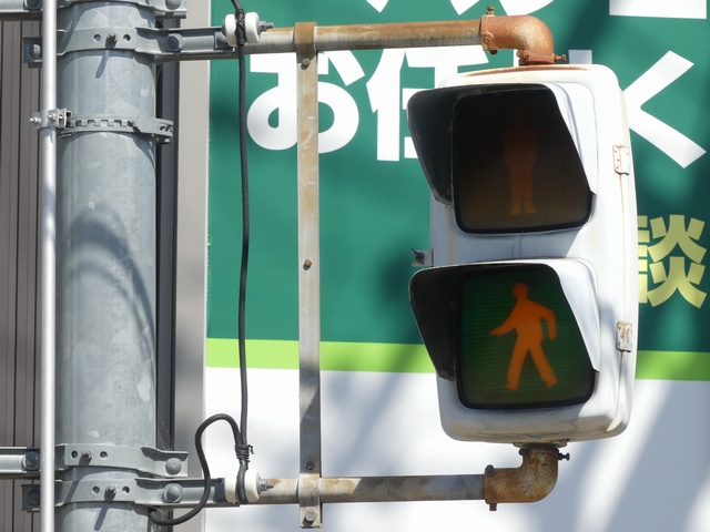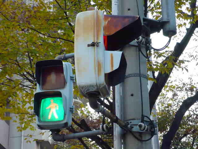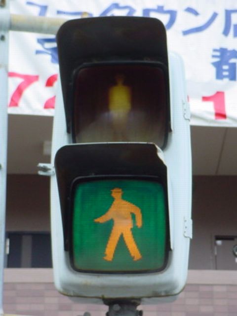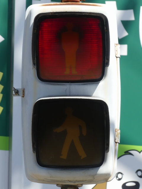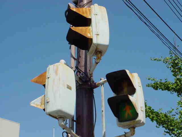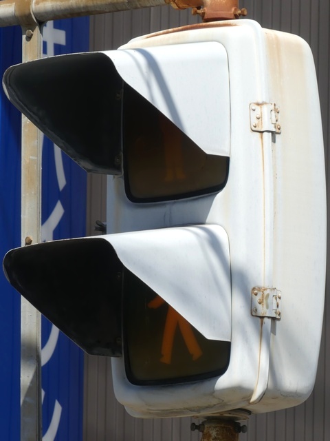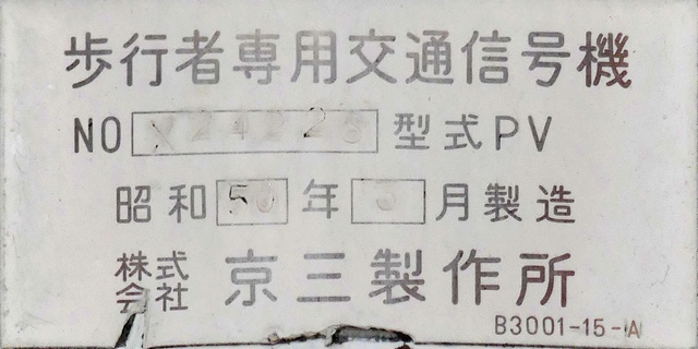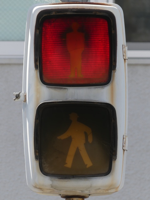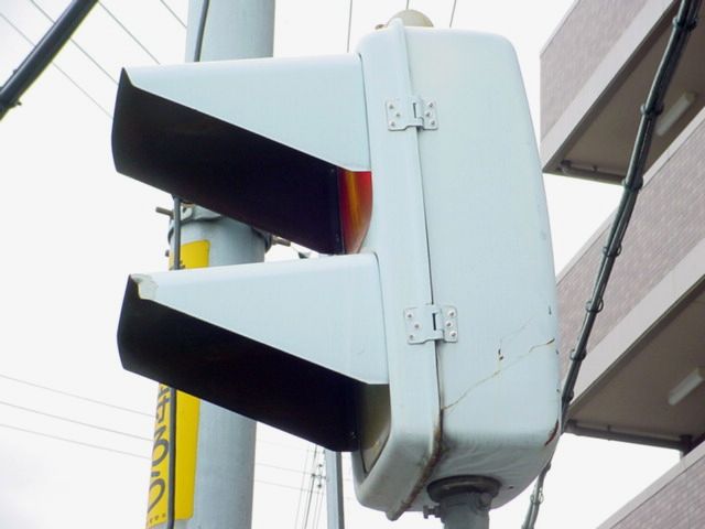 大阪府では、京三製作所製の初期の歩行者用灯器で横から見ると三角形の長いフードが使用されていました。