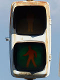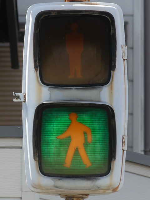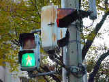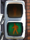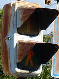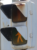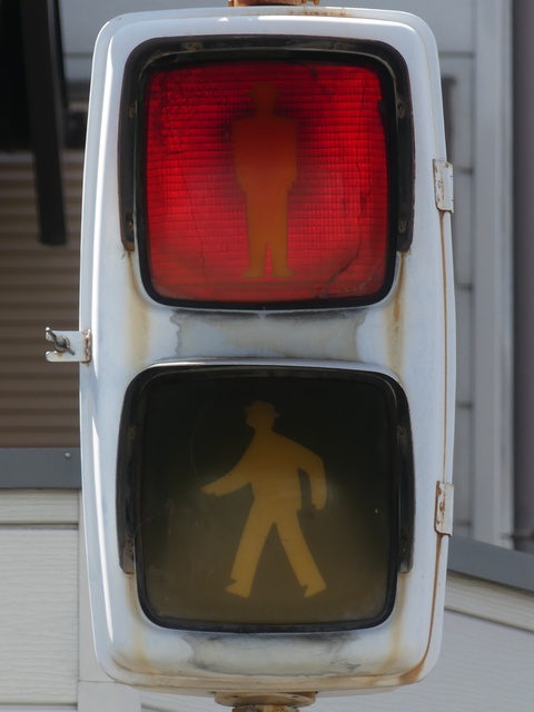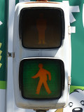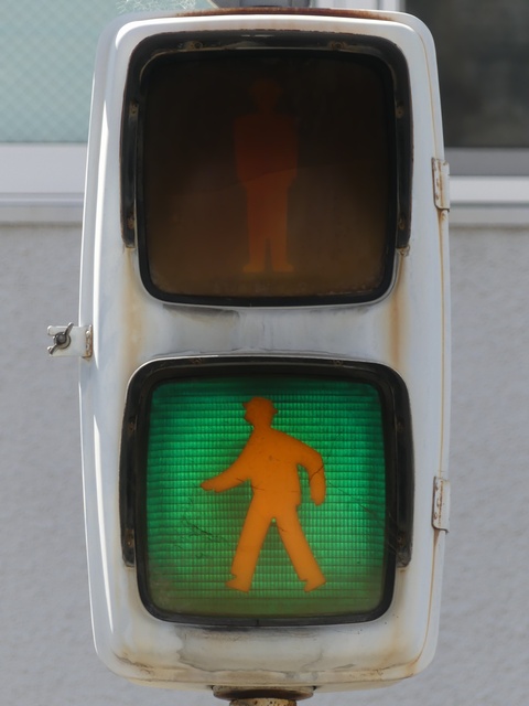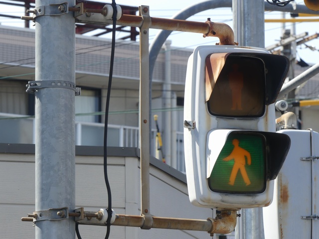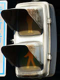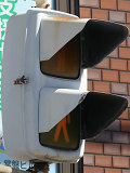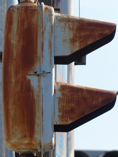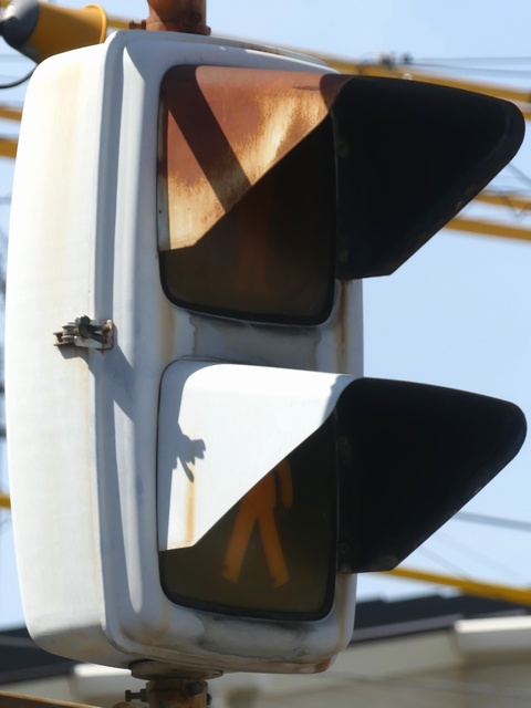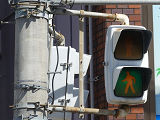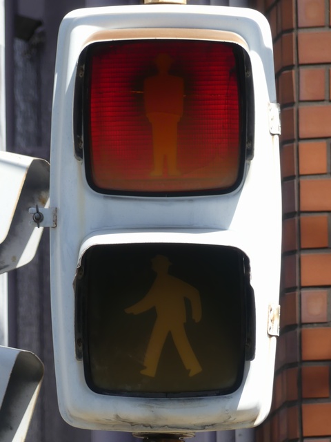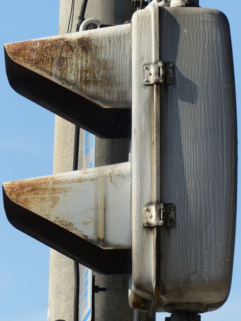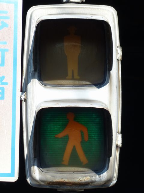大阪府では、京三製作所製の初期の歩行者用灯器で横から見ると三角形の長いフードが使用されていました。