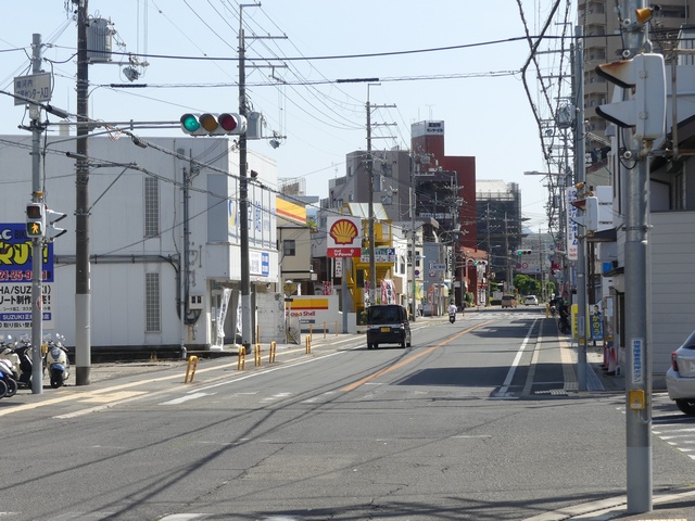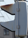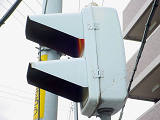 日本信号製でも、似た形状のフードがこの交差点で1基のみ設置されていました。京三製のものより長いものとなっています。
