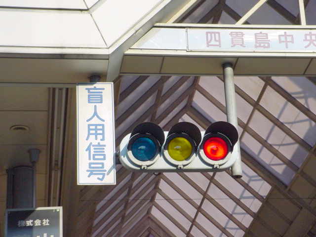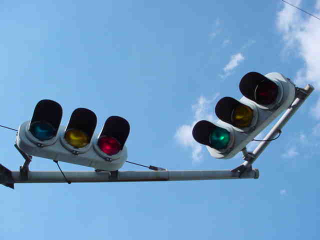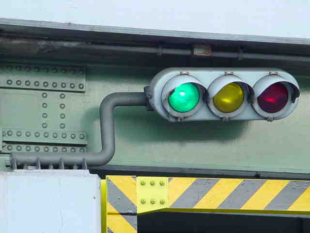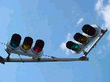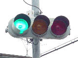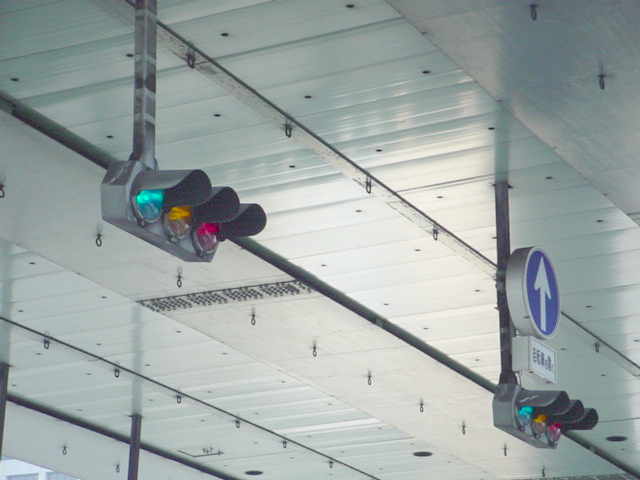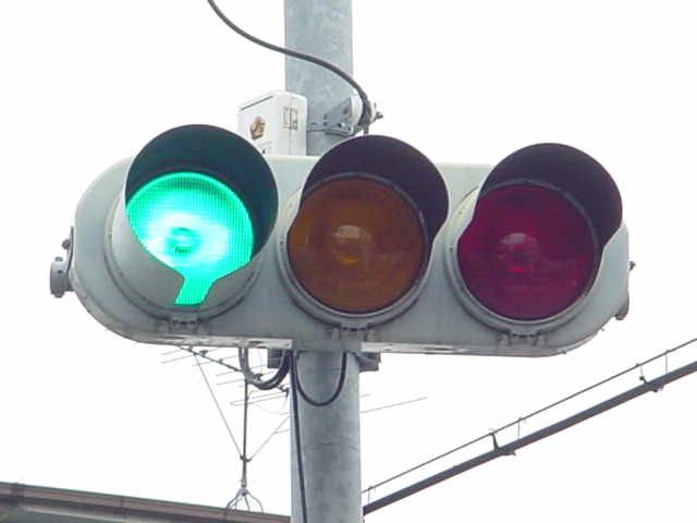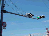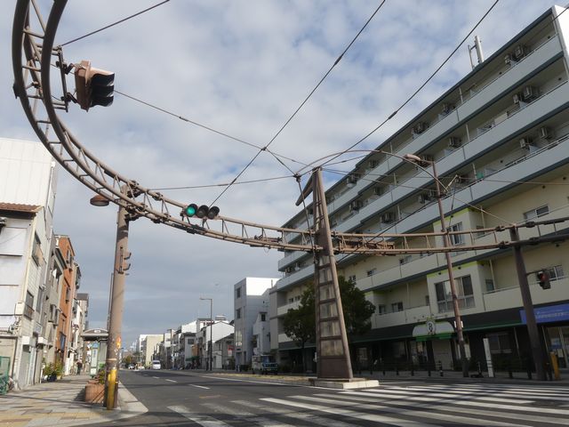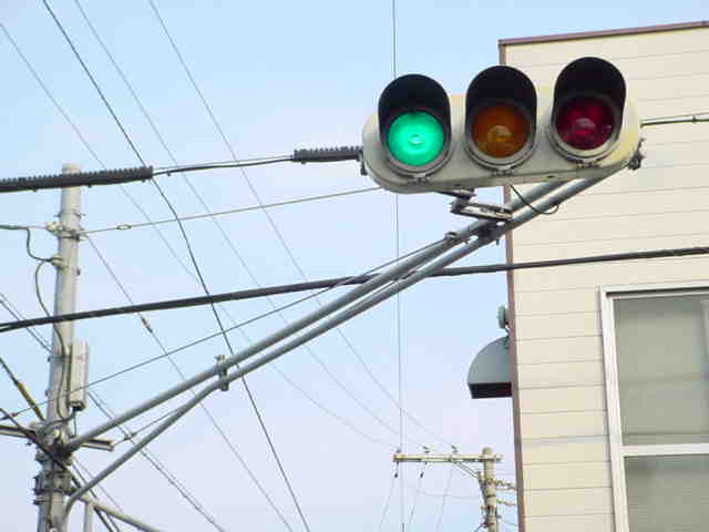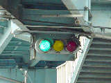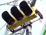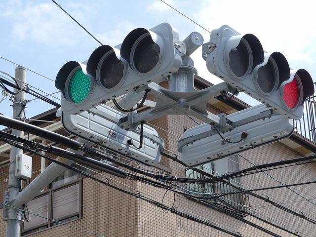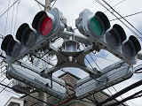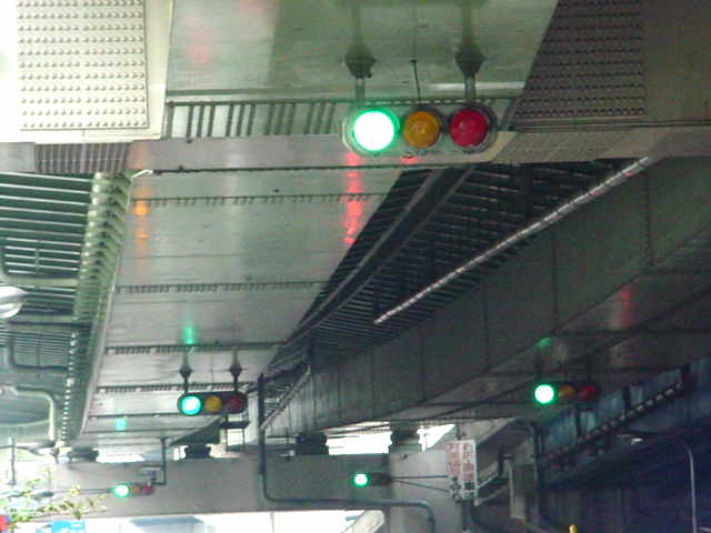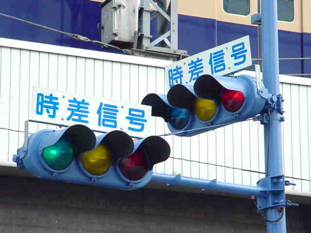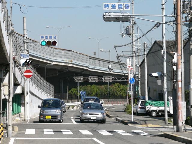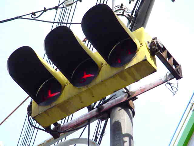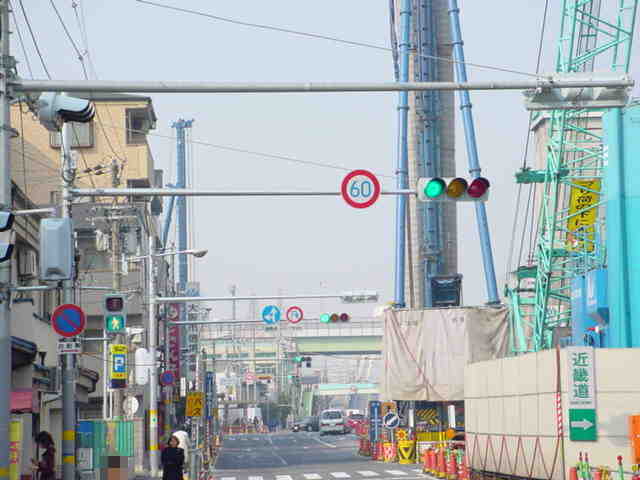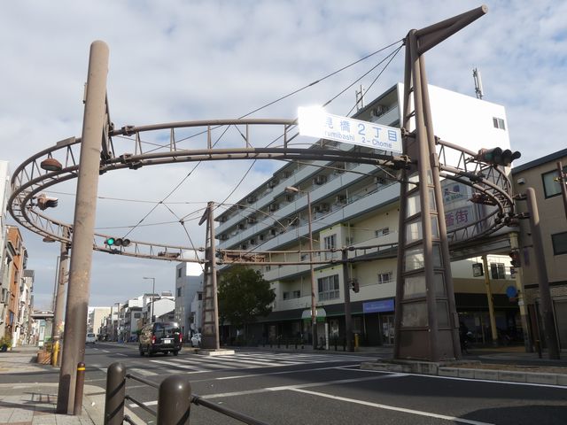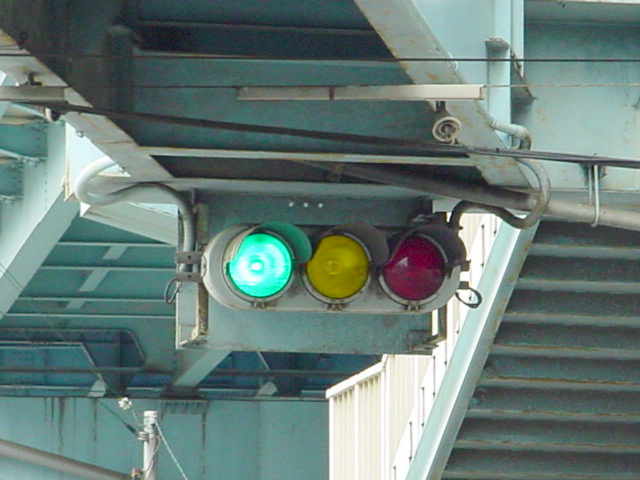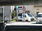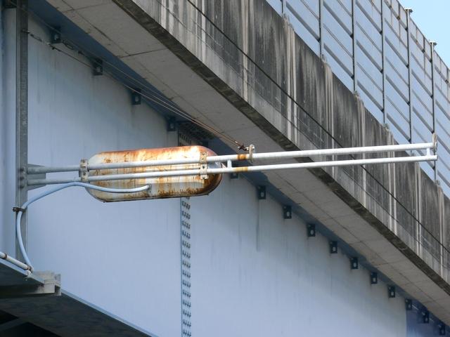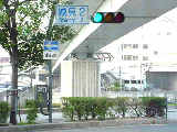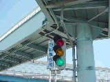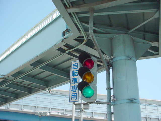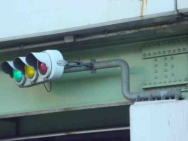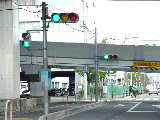手前が橋で道路が一段高くなっていて、普通の高さに設置すると橋の手前からでは灯器が道路の陰になって見えなくなってしまうためです。 |