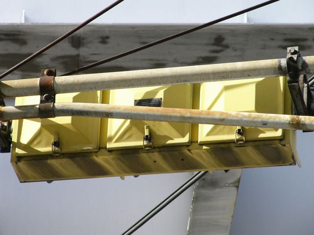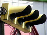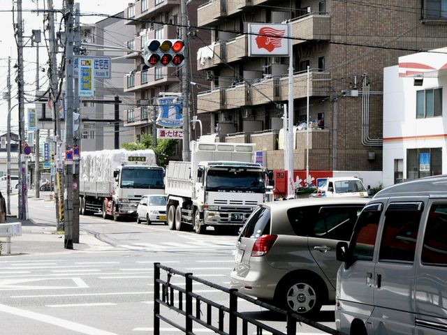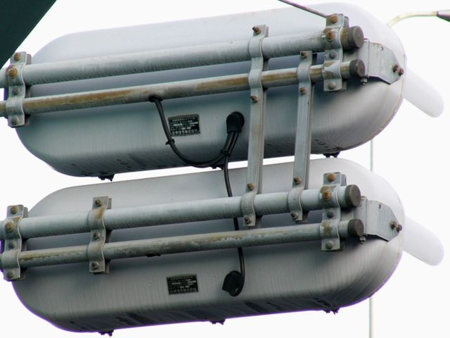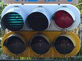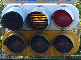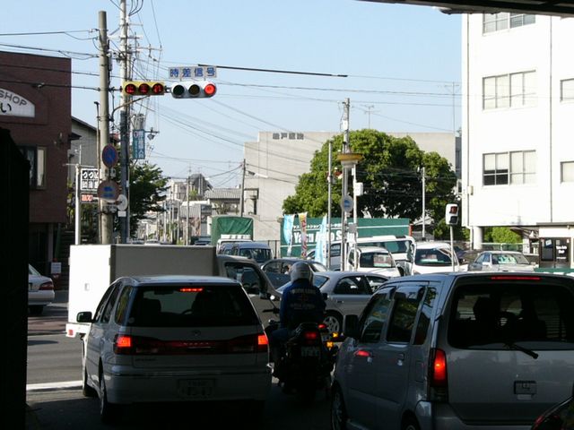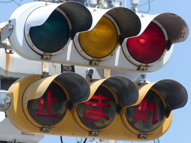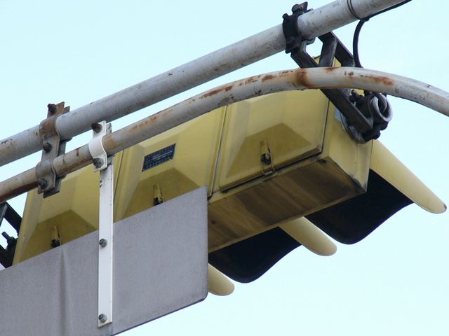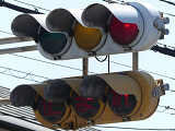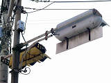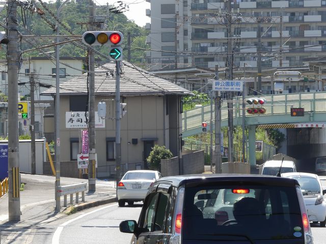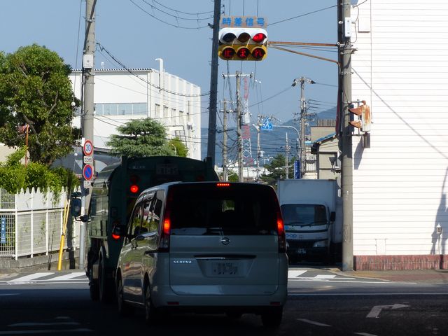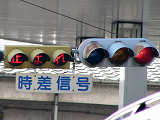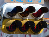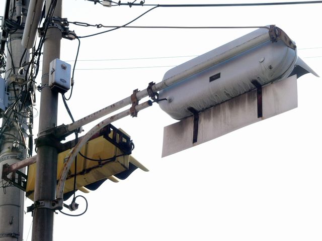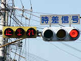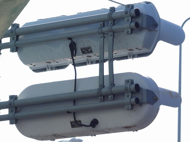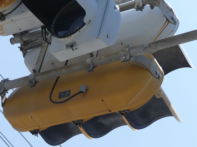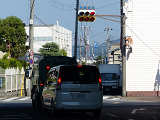 こちらは、黄色塗装の小糸工業製丸型灯器を使用したタイプです。連続交差点を1つの交差点と勘違いして信号無視するのを防ぐため、連続交差点奥側の交差点に設置されています。
