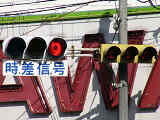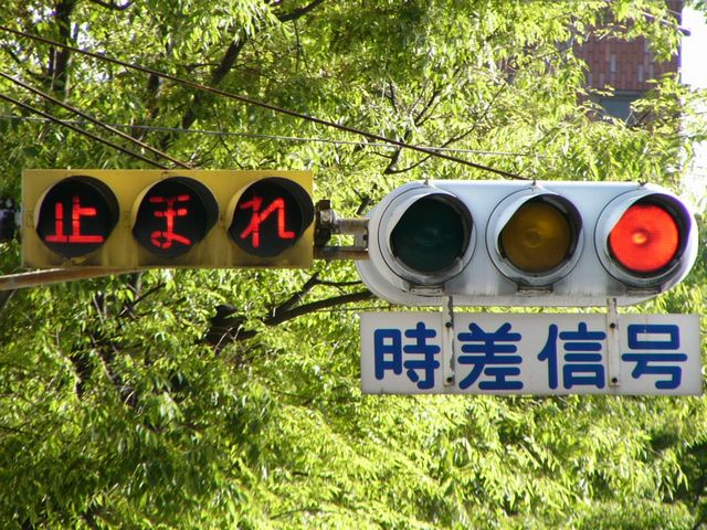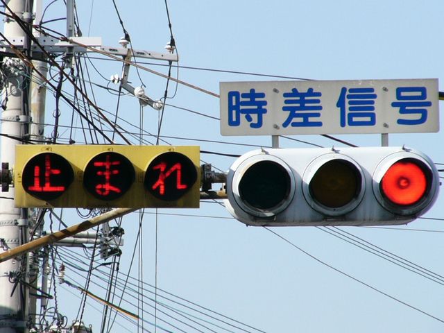 こちらは、通常塗装の日本信号製丸型灯器を使用したタイプです。「マレ」がカタカナ表記です。連続交差点を1つの交差点と勘違いして信号無視するのを防ぐため、連続交差点奥側の交差点に設置されています。