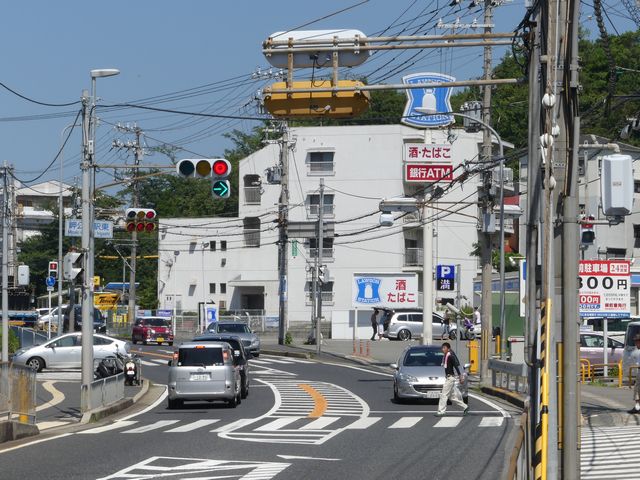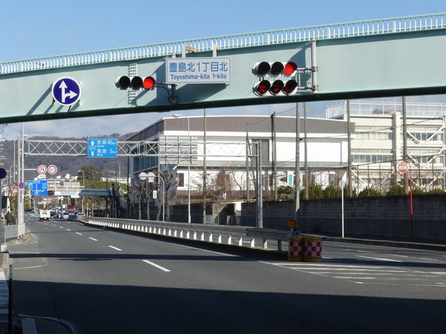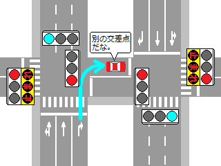 こちらは、黄色塗装の京三製作所製丸型灯器を使用したタイプです。連続交差点を1つの交差点と勘違いして信号無視するのを防ぐため、連続交差点奥側の交差点に設置されています。