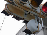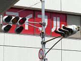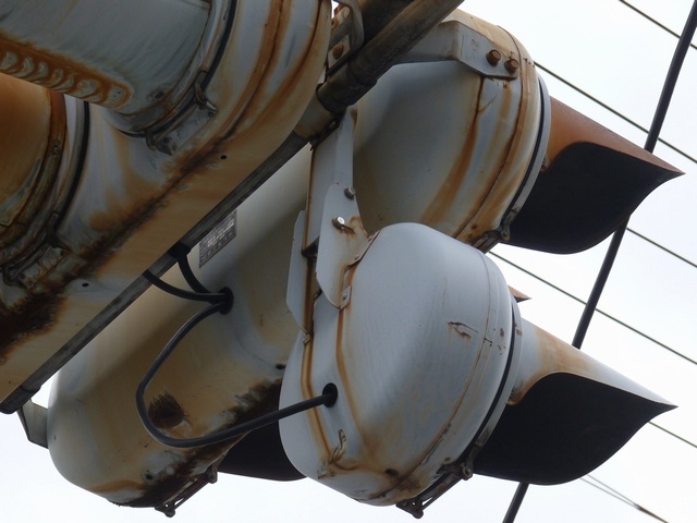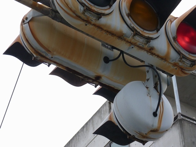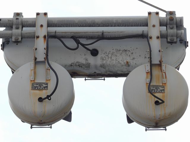 京三製作所製初期の丸型灯器の矢印灯器です。この交差点の東進用主灯器とその背面灯器の右折矢印灯器として設置されていました。京三製初期丸形矢印灯器はアームから吊り下げられる形で設置されます。このタイプの矢印灯器は銘板がないことが多く、この矢印灯器にも銘板がありませんでした。なお、本灯器は昭和54年4月製でした。