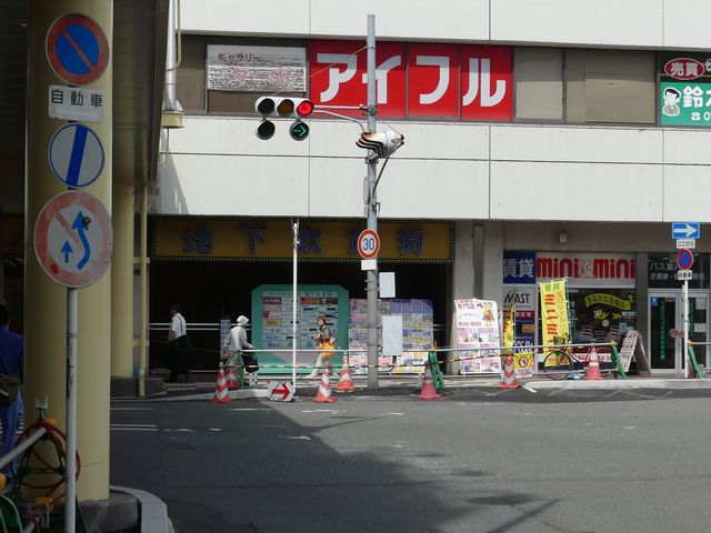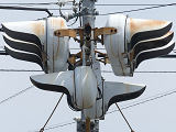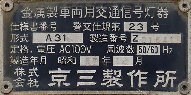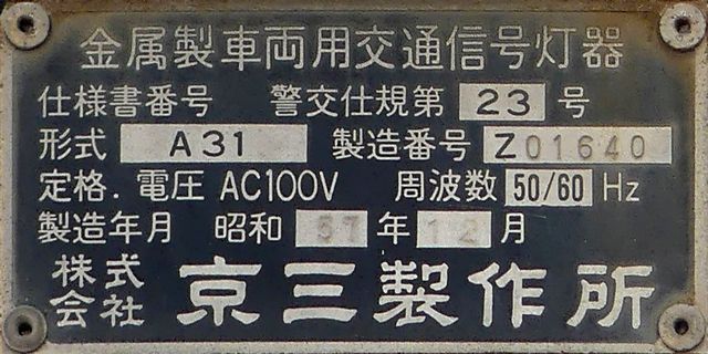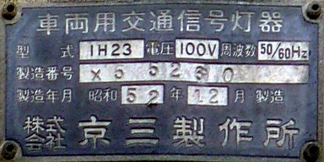 京三製作所製初期の丸型灯器の矢印灯器です。この交差点の西進用灯器に左折矢印灯器と右折矢印灯器が設置されていました。京三製初期丸形矢印灯器はアームから吊り下げられる形で設置されます。このタイプの灯器としては珍しく銘板が取り付けられており、昭和57年12月製で本灯器(昭和54年8月製)より新しいものでした。