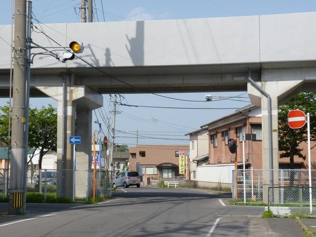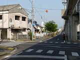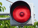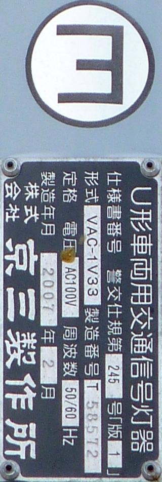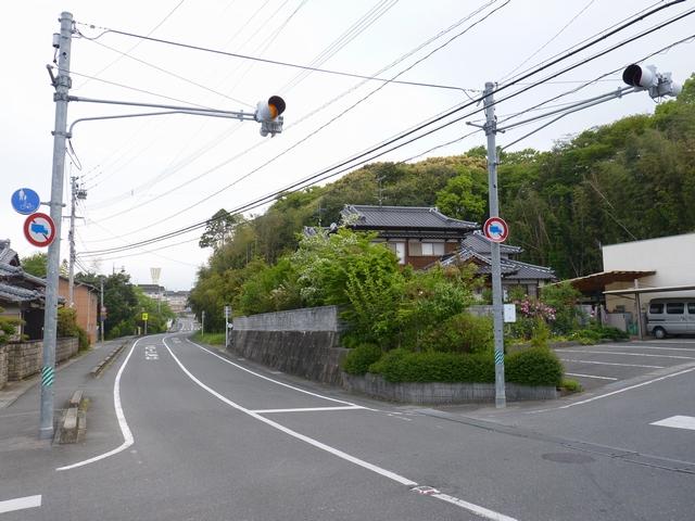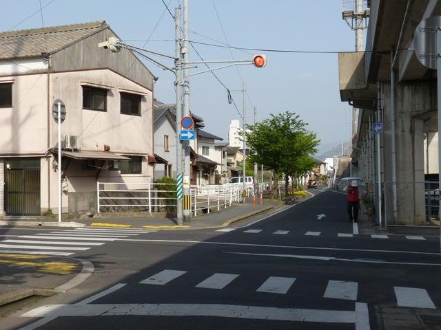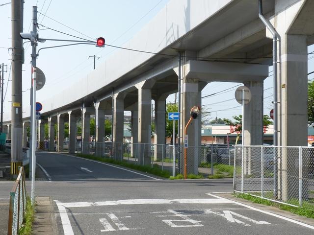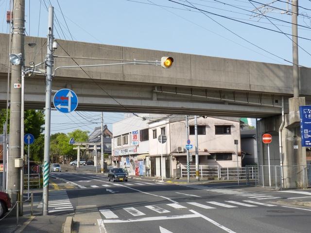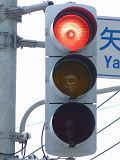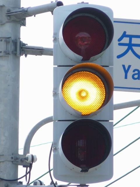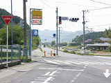 押ボタン式信号の主道路と鋭角に交差する従道路で使用されています。この従道路と押ボタン式の横断歩道がほぼ直交する形になっているため、歩行者が横断するときには主道路と同じく赤信号に、それ以外は赤点滅で一時停止させます。赤点滅は下赤を、赤信号は上赤を使用し、赤点滅から赤信号になるときに黄信号を挟みます。