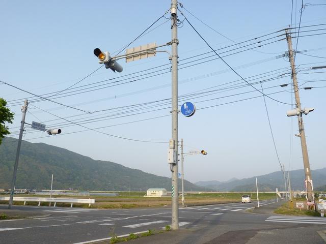 ここでは全方向に補助灯器が設置されています。佐賀県の通常の信号交差点では、主灯器が直径300mmレンズ灯器、補助灯器が直径250mmレンズ灯器となっている場合が多く、4方向1灯点滅でも同様に設置されています。