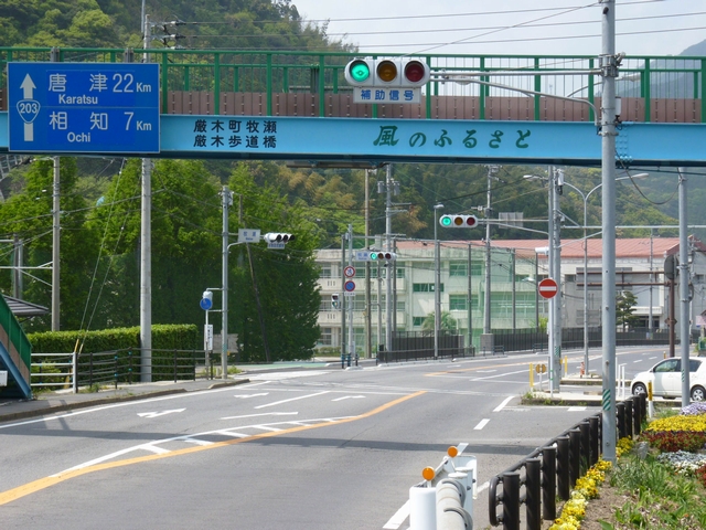 佐賀県の予告信号は、「補助信号」の標示板が併設されています。交差点からかなり離れた位置でも、信号は交差点と同じサイクルです。ほかの方式もあります。