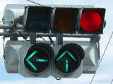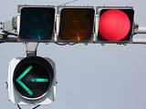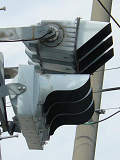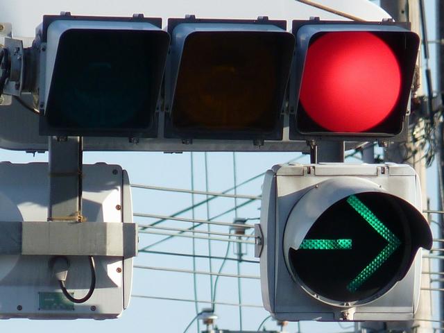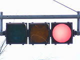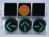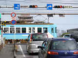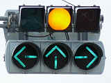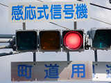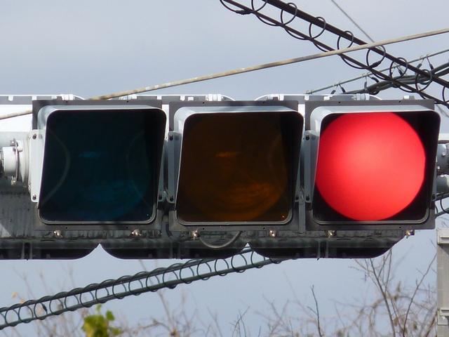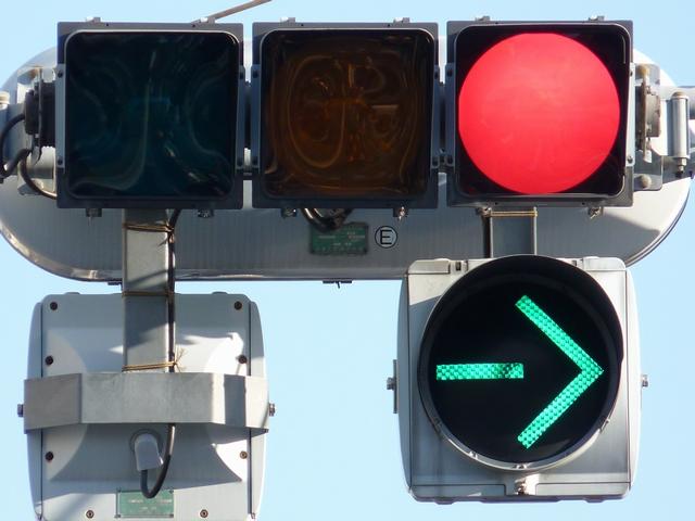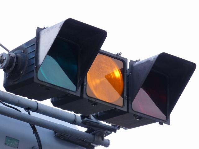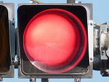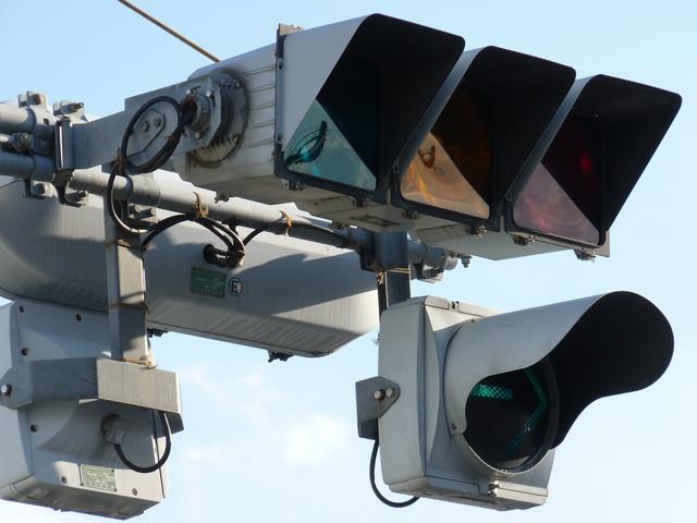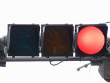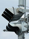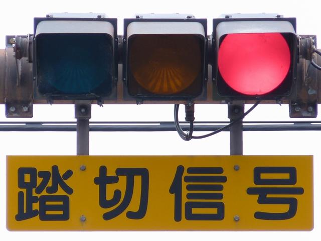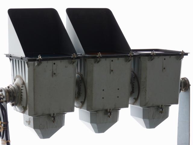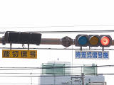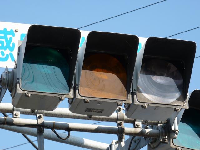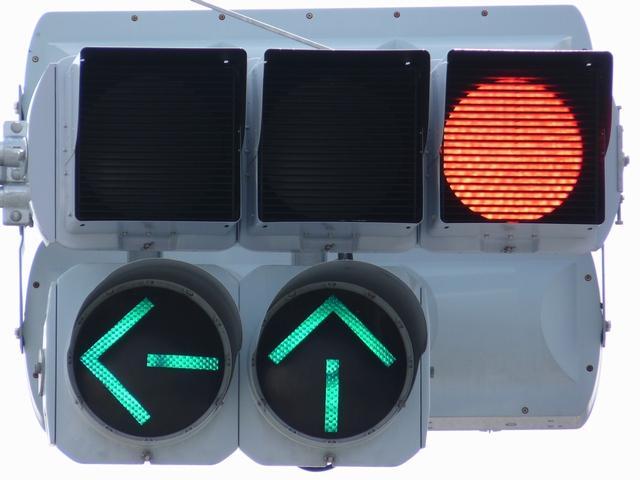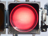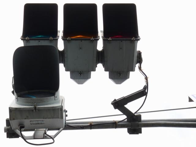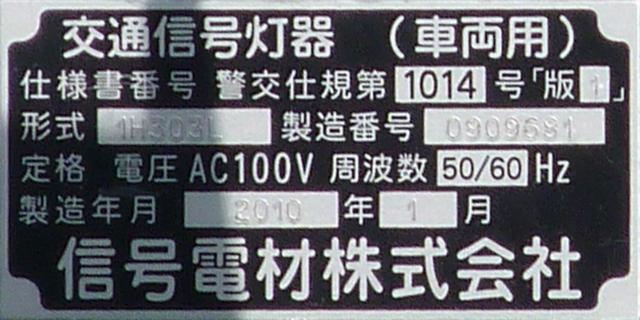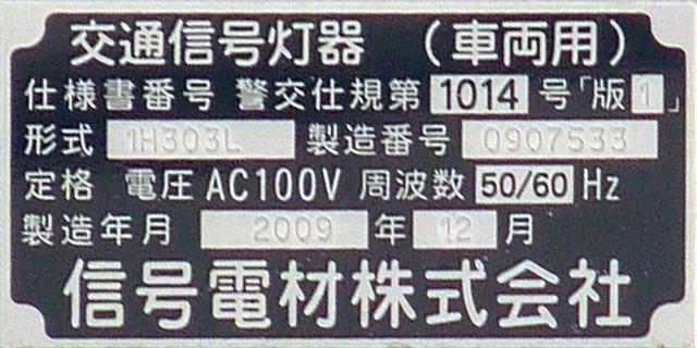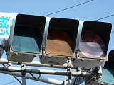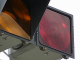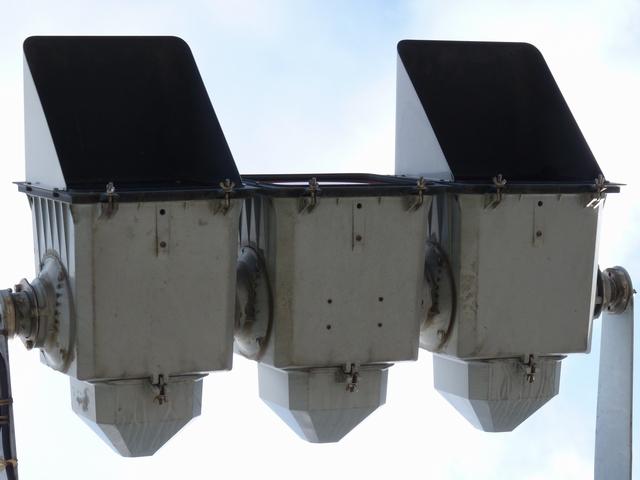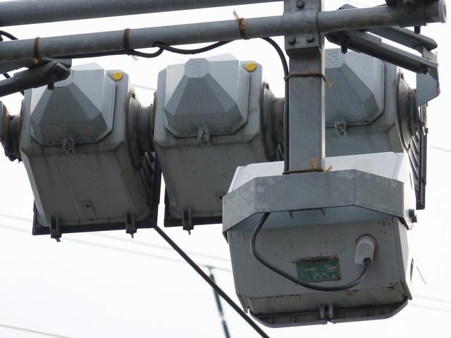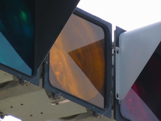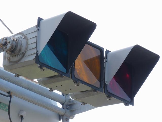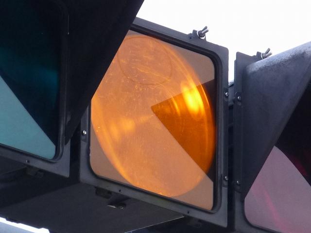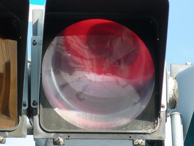 通常の偏光灯器は、レンズに青、黄、赤の色が付いていますが、この偏光灯器の赤灯は、レンズに色が付いておらず白色に見えます。点灯したときの灯火は赤色ですが、正面から見ると輪がかかったように見えます。