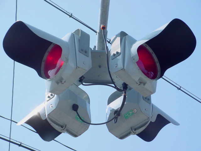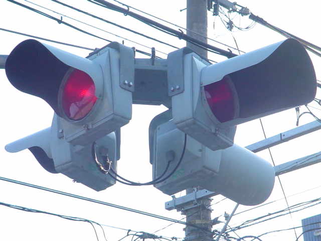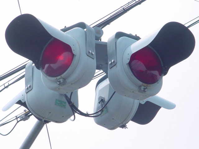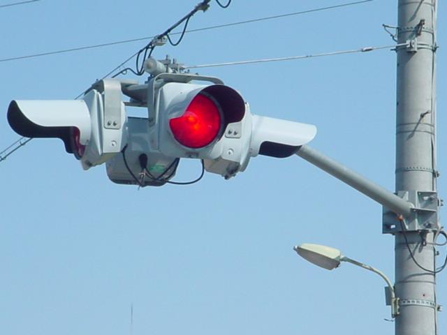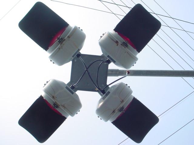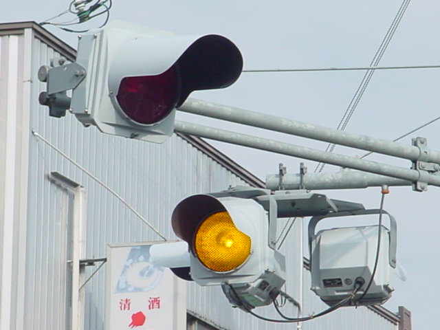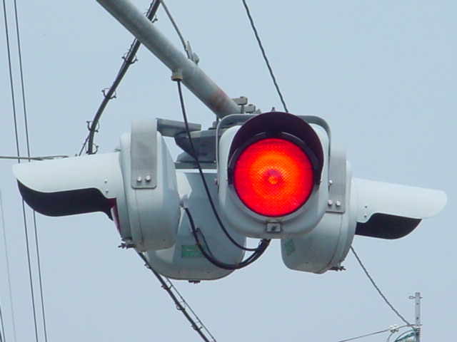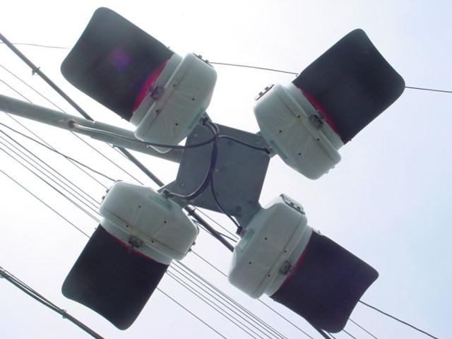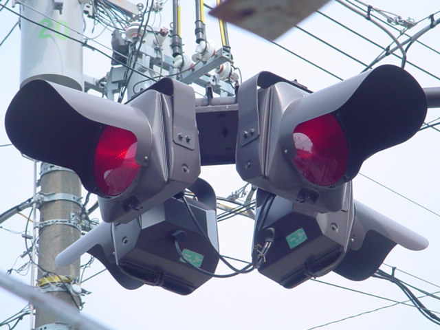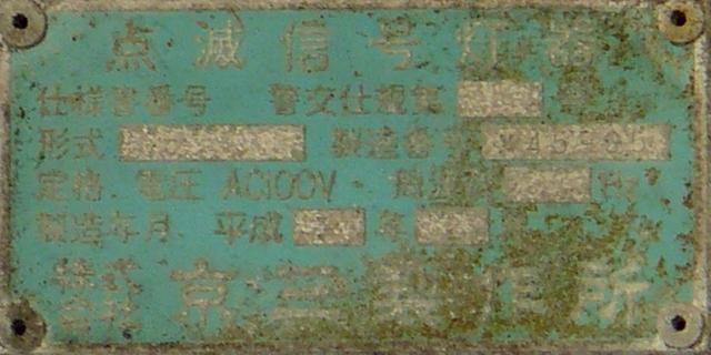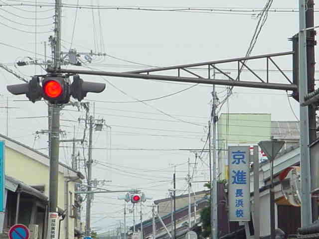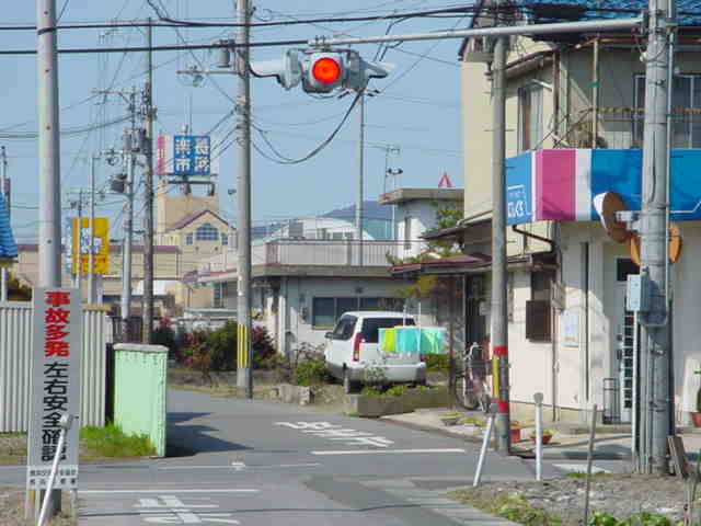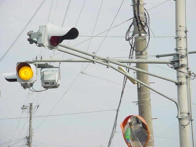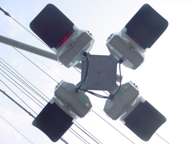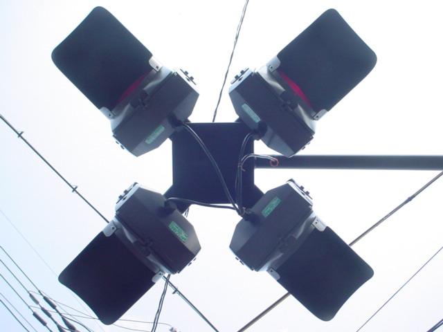 2003年1月に通った時には普通の4方向1灯点滅(2方向黄点滅、2方向赤点滅)でしたが、2003年5月に通った時には全方向赤点滅に改良されていました。この時期に長浜市朝日町一帯の4方向1灯点滅がすべて全方向赤点滅に改良されました。レンズのみを取り替えたようです。