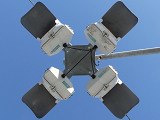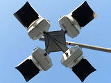 交差点南の道路が斜めに交差しているため、その道路に対する1位だけ別のアームに設置されています。そのため本体には3方向のみに灯器が設置されています。