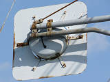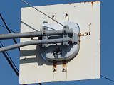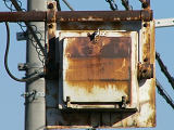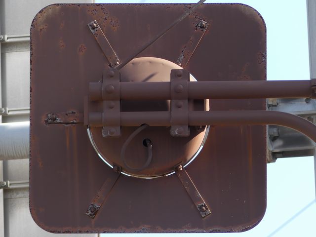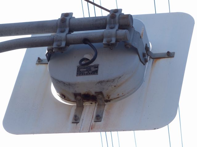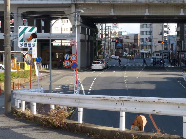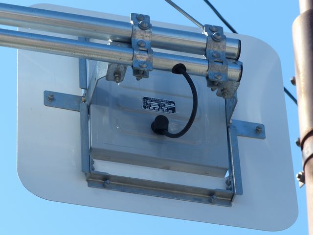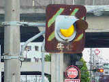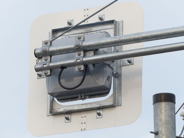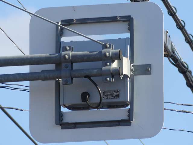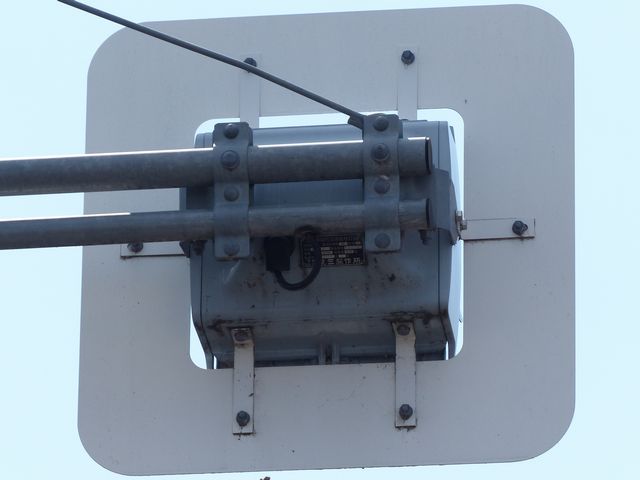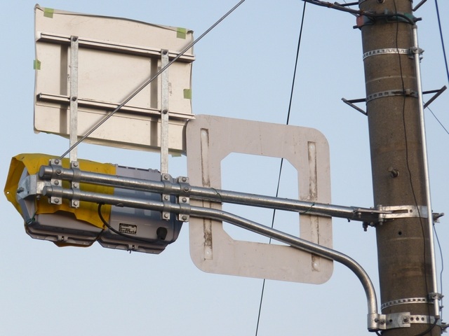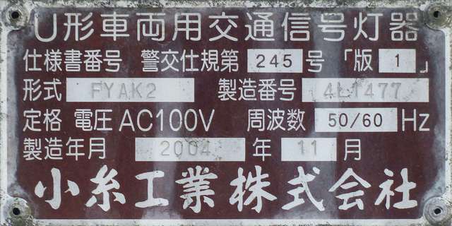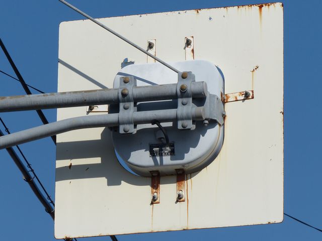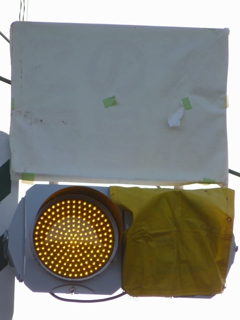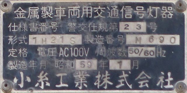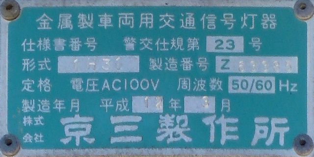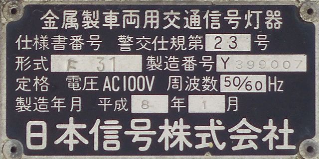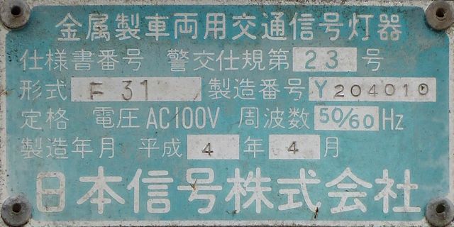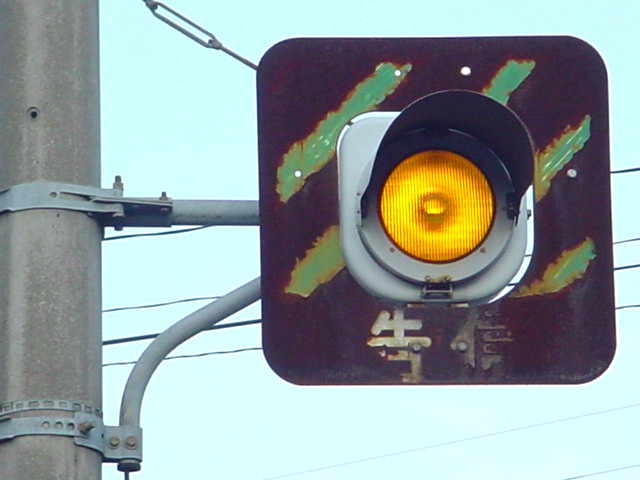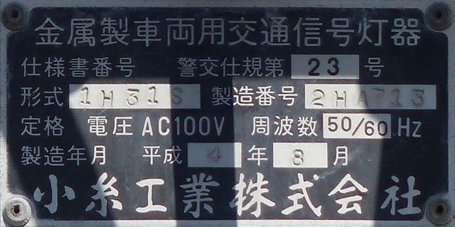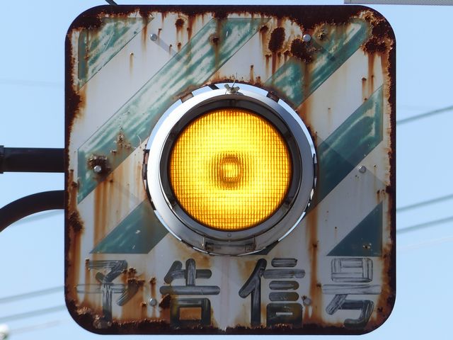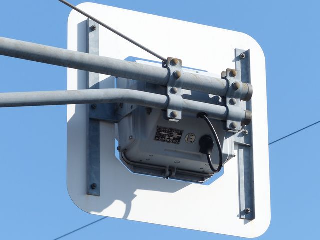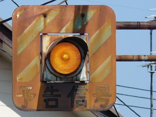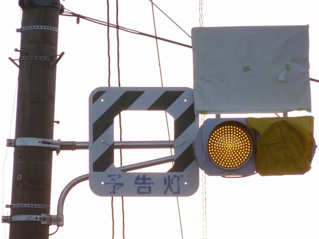 予告信号の灯器も黄1位式から黄・黄2位式に更新され「この先信号機」の標示板が用意されています。しかし、右黄に工事幕を付けて左黄だけの1位式として使用しています。標示板も新しい「この先信号機」はマスクして、もともとあった「予告信号」標示板一体の背面板を針金でアームに縛り付けています。おそらく制御機は更新前のものを使用しているため、配線の都合で1位式として使用しているのでしょう。わざわざ1位式予告信号の標示板を設置しているということは、予告信号の運用基準が厳格に決まっているのでしょうか。