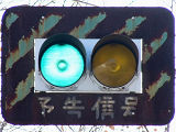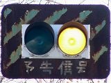 滋賀県の青・黄の2位式灯器による「予告信号」は、通常、背面板と標示板が一体になったものが併設されていますが、まれに背面板のないものもあります。