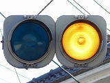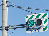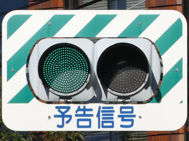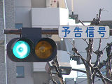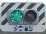 前方の交差点の信号が青の時に予告信号の青が点灯し、前方の交差点の信号が黄・赤の時に予告信号が黄点滅します。