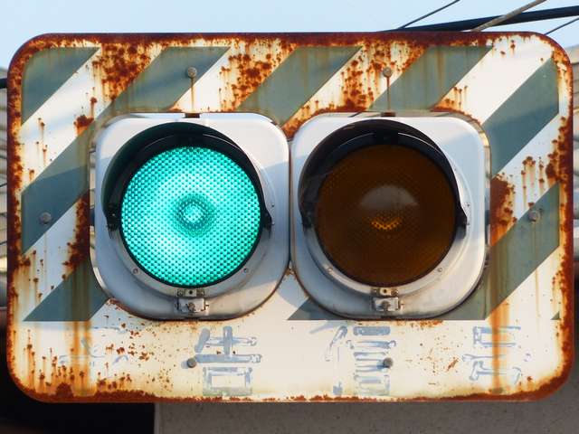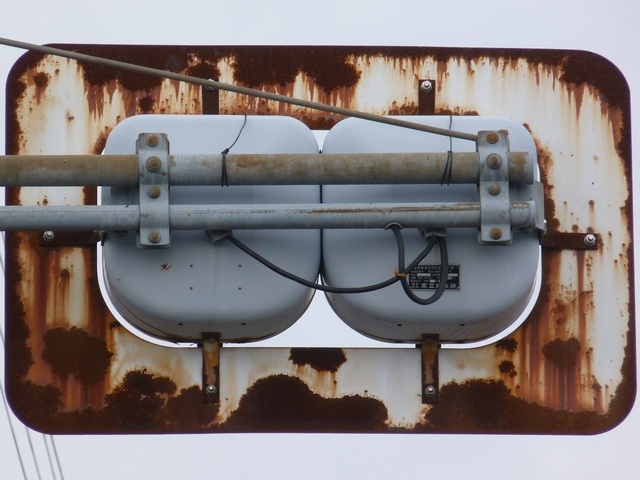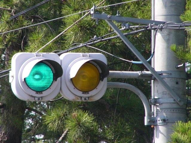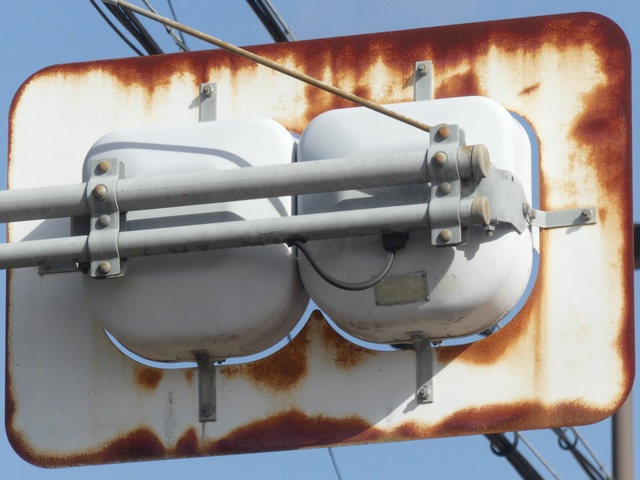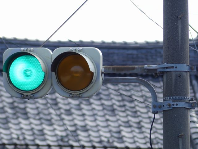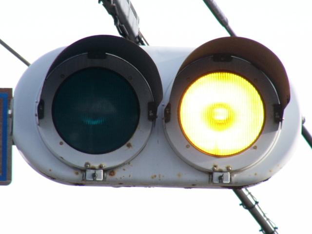 滋賀県の青・黄の2位式灯器による「予告信号」は、通常、背面板と標示板が一体になったものが併設されていますが、まれに背面板も標示板も併設されていないものもあります。