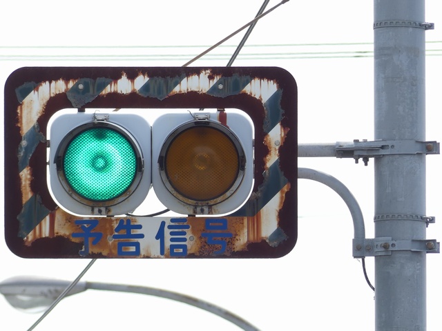 滋賀県の青・黄の2位式灯器による「予告信号」は、通常、背面板と標示板が一体になったものが併設されていますが、まれに「予告信号」表示のないものもあります。