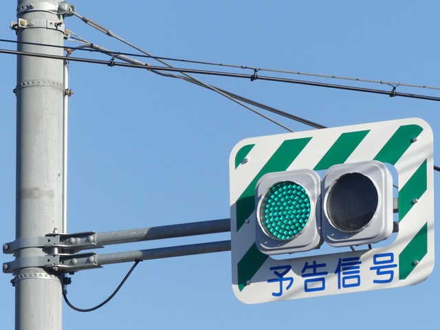 道路に起伏がある箇所の前後に信号交差点があるために「予告信号」が前後設置されていますが、片面は青・黄の2位式、もう片面は1位式が設置されています。なお、平成26年度工事で1位式の方のみが更新されましたが、背面板の「予告信号」の表示がなくなりました。