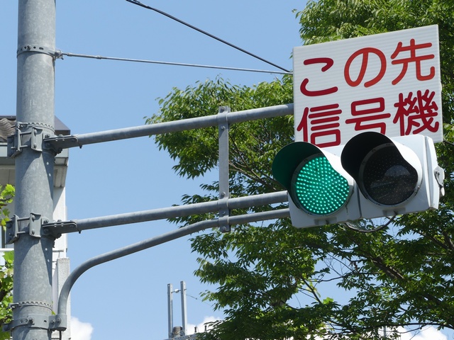 滋賀県で見かける2位式の予告信号は、青・黄で「予告信号」の標示板があるものか、黄・黄で「この先信号機」の標示板のあるものがほとんどですが、ここでは、青・黄の2位式灯器に「この先信号機」の標示板が設置されています。信号サイクルは、「予告信号」の標示板のあるものと同じです。