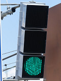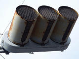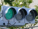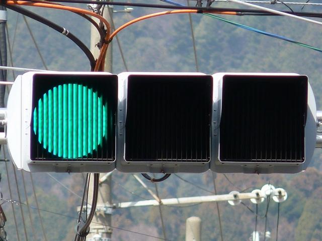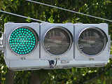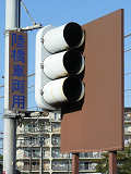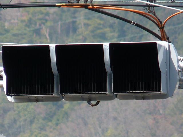 滋賀県では大変珍しい信号電材分離型灯箱+多眼レンズ+SD制限フードの組み合わせです。鋭角交差点での誤認防止のため、この交差点に2基設置されていましたが、平成24年度の工事でSD制限フード付き薄型灯器に交換されました。
