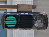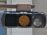 連続交差点での誤認防止のため、青灯と黄灯に距離制限フードが装着されていました。平成24年度の工事で全色SD制限フード付き薄型灯器に交換されています。