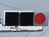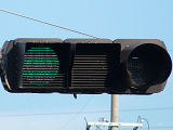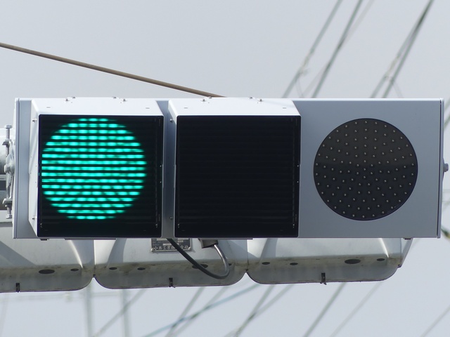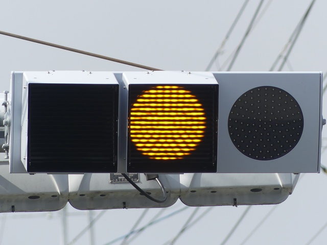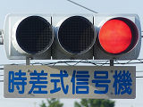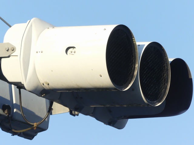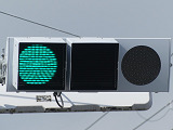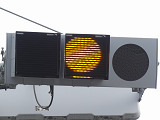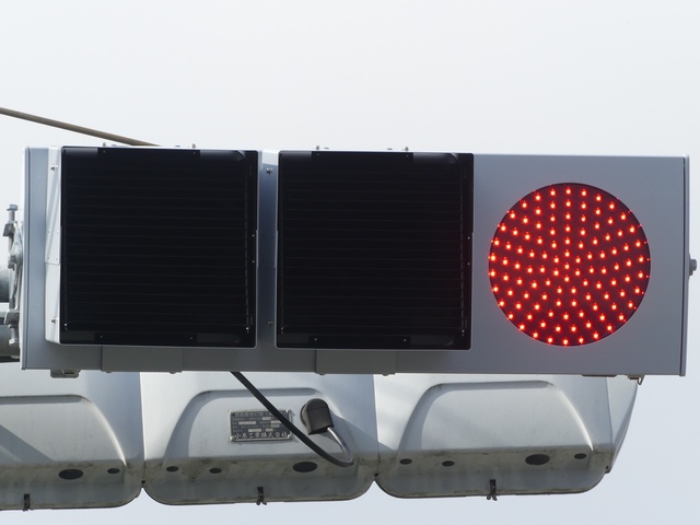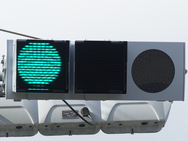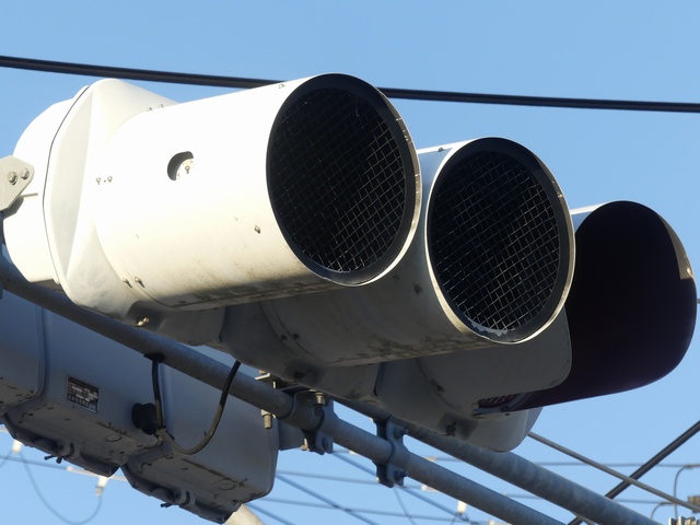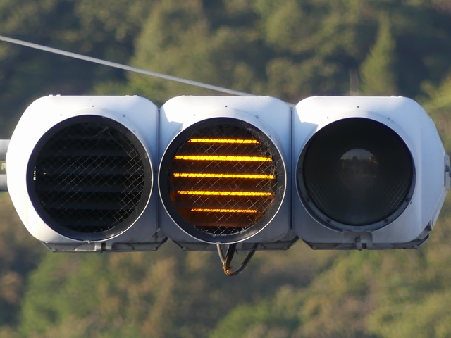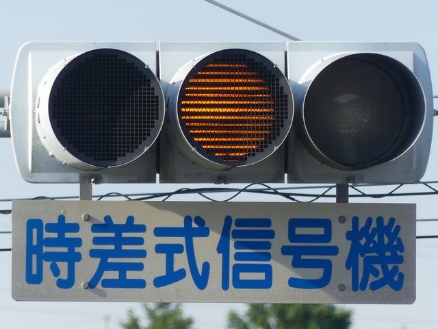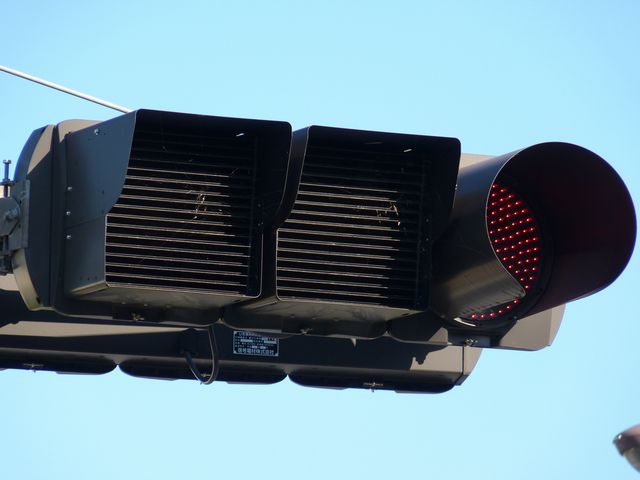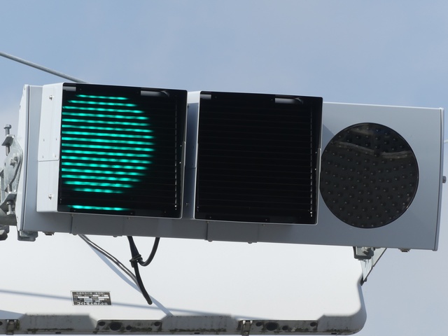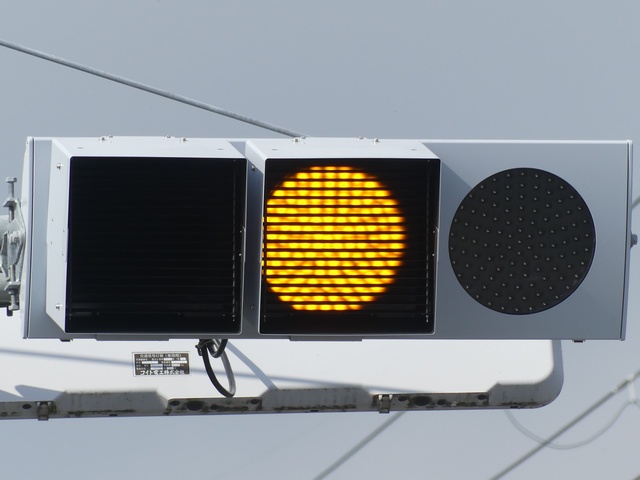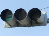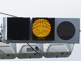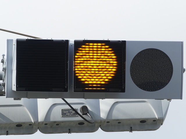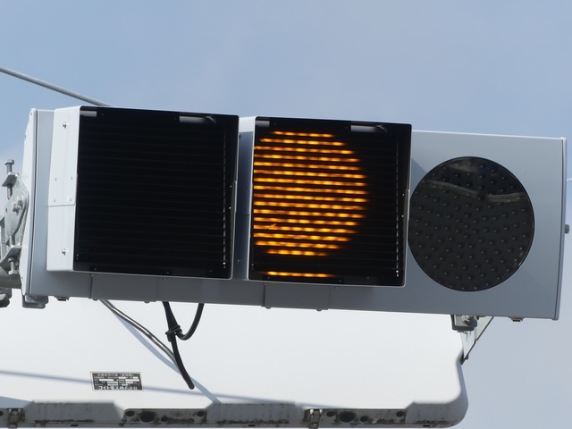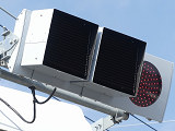 連続交差点での誤認防止のため、青灯と黄灯に距離制限フードが装着されています。補助灯器は、3色とも距離制限フードが装着されています。