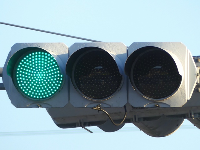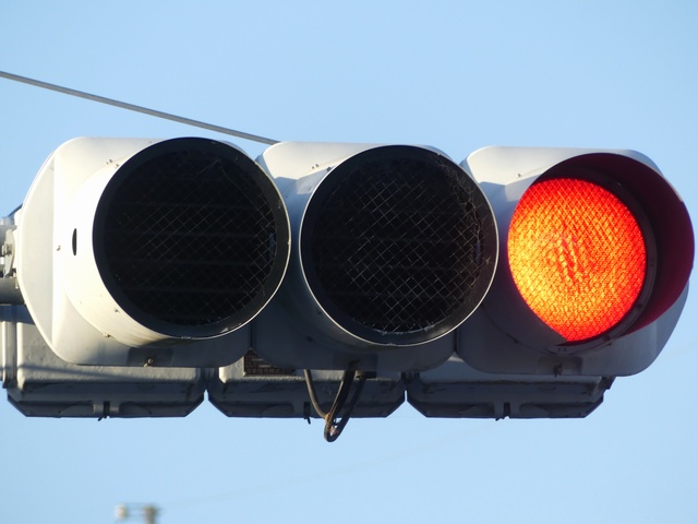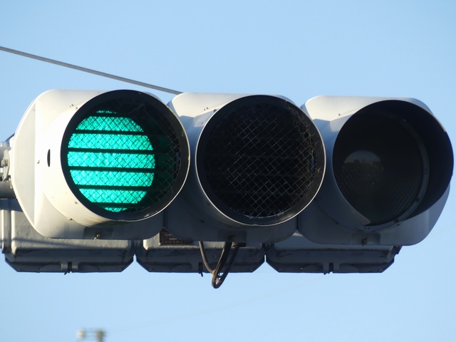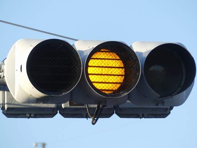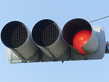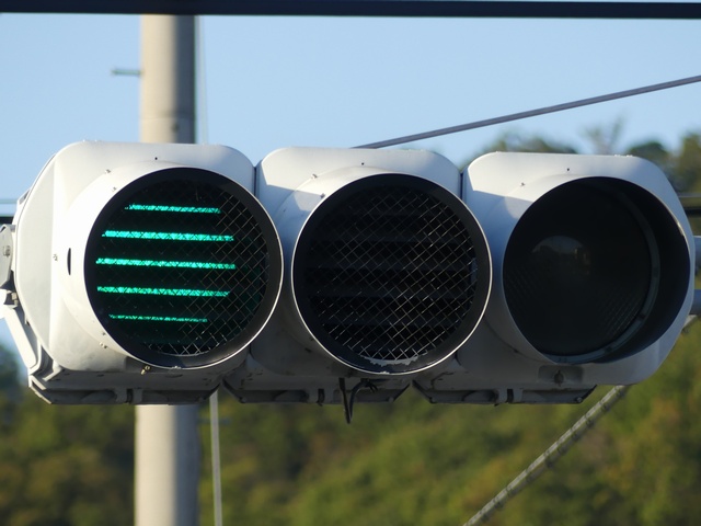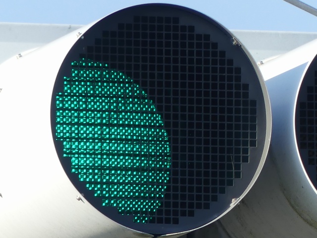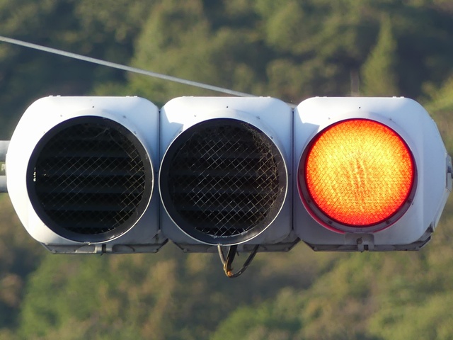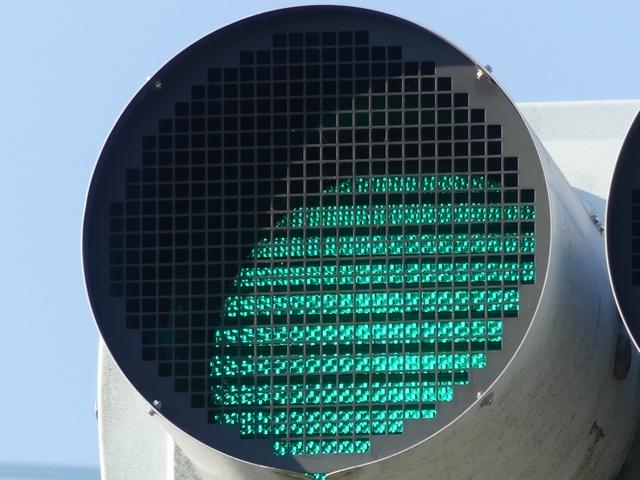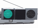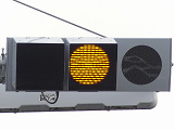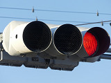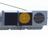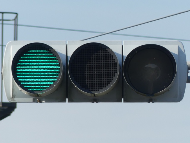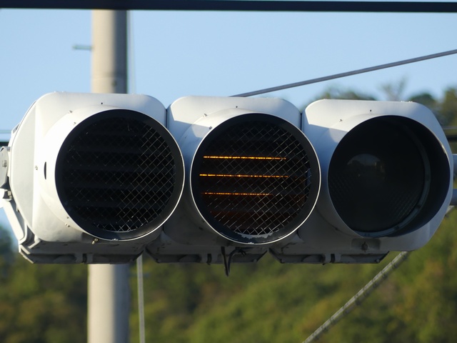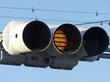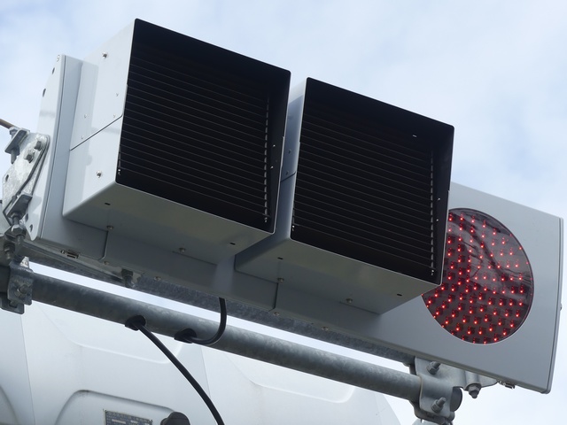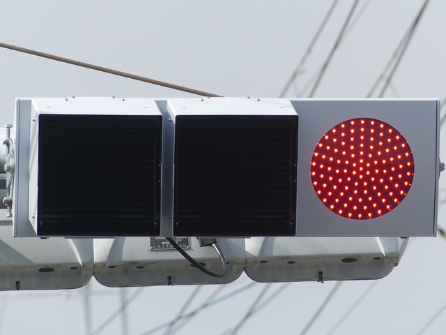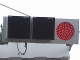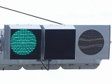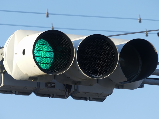 連続交差点での誤認防止のため、青灯と黄灯に距離制限フードが装着されています。補助灯器は、3色とも距離制限フードが装着されています。
