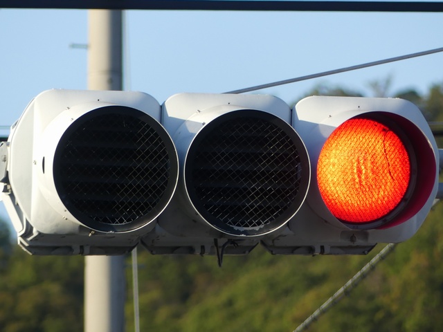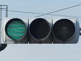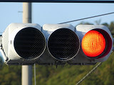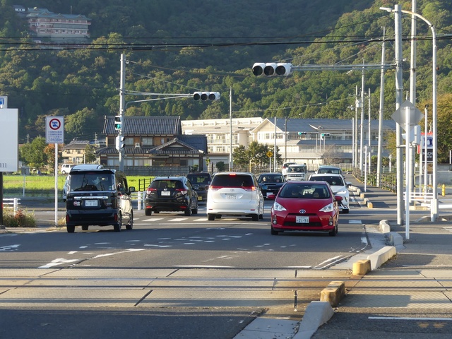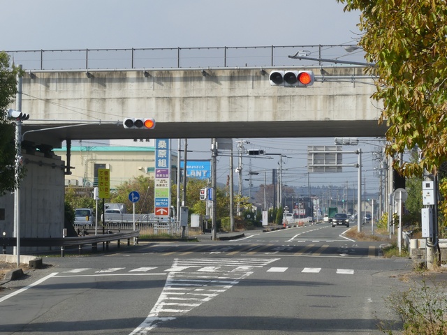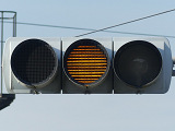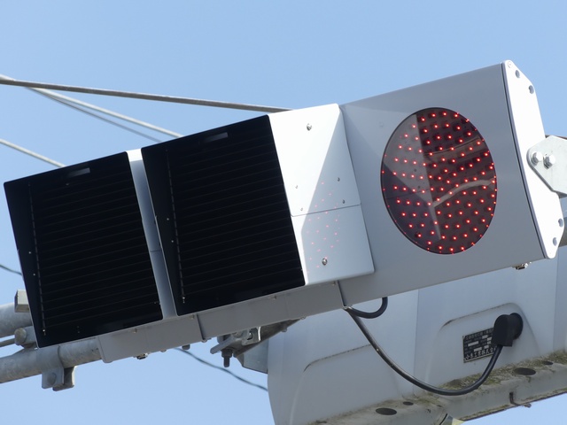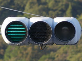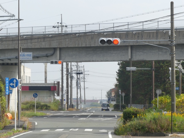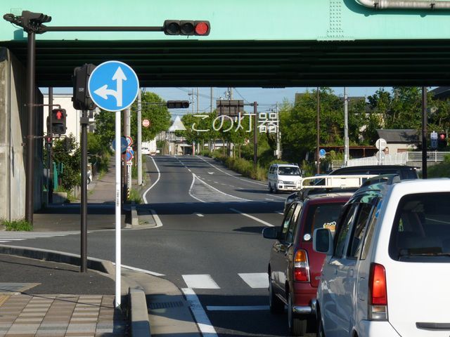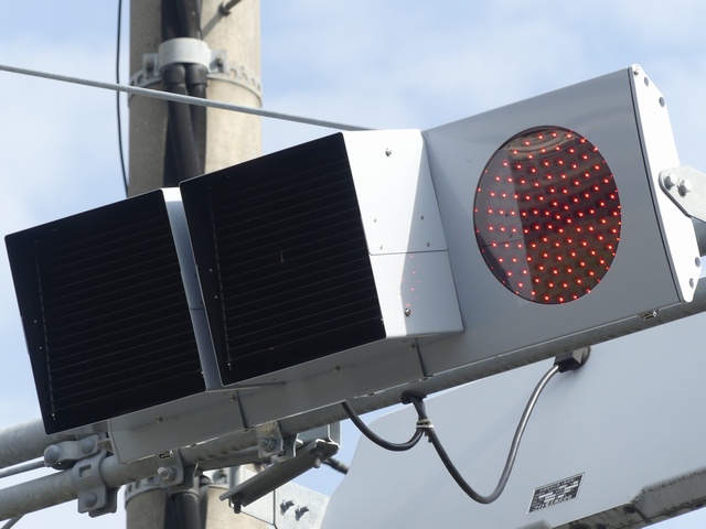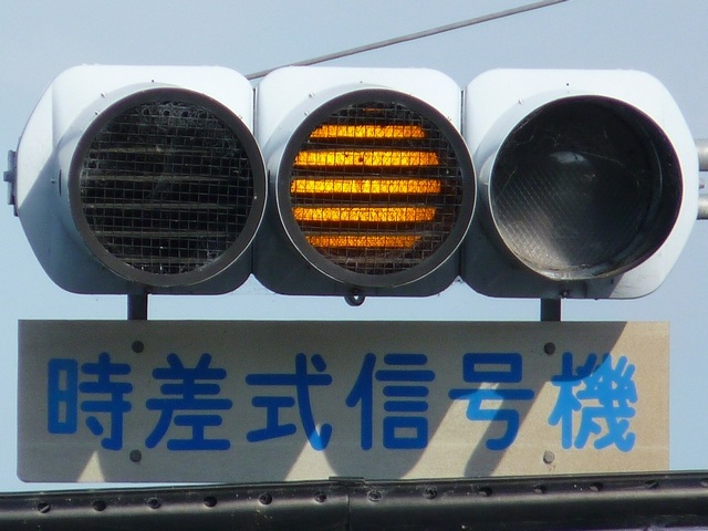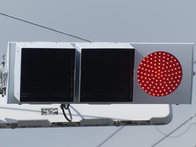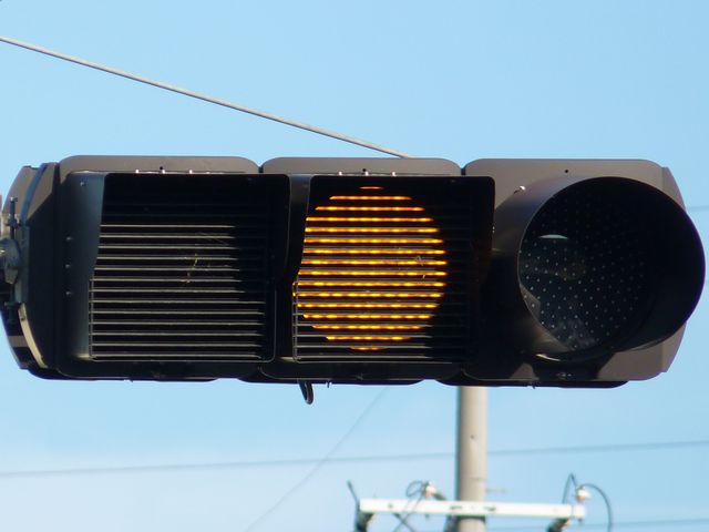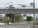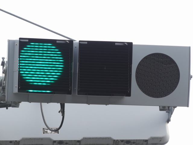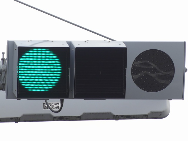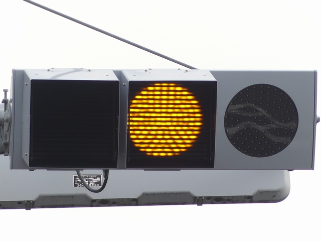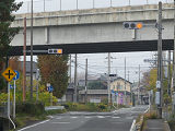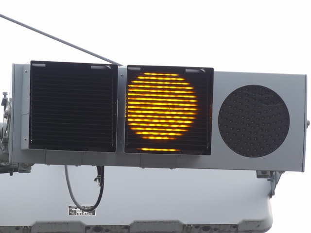 信号交差点のすぐ手前に踏切があるため、踏切での一時停止を怠らせないよう、青灯と黄灯に距離制限フードが装着されています。