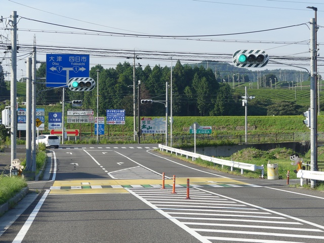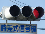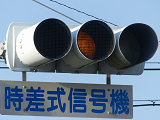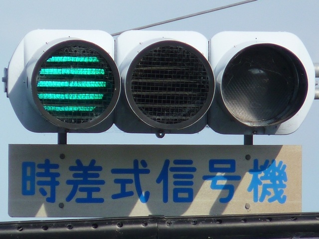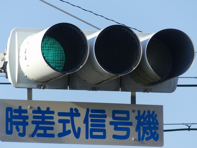 連続交差点での誤認防止のため、青灯と黄灯に距離制限フードが装着されています。