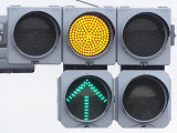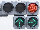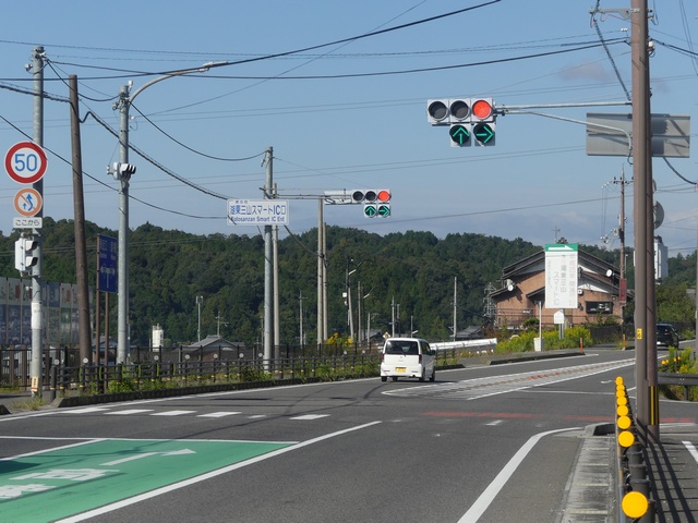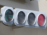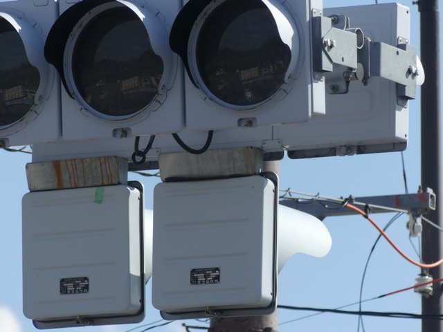 直進矢印灯器と右折矢印灯器を離して設置しています。ほかの交差点で使われていた矢印灯器を転用しているようです。