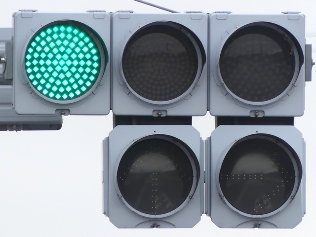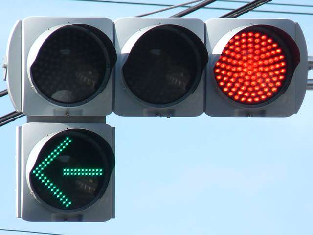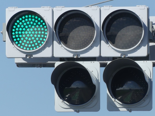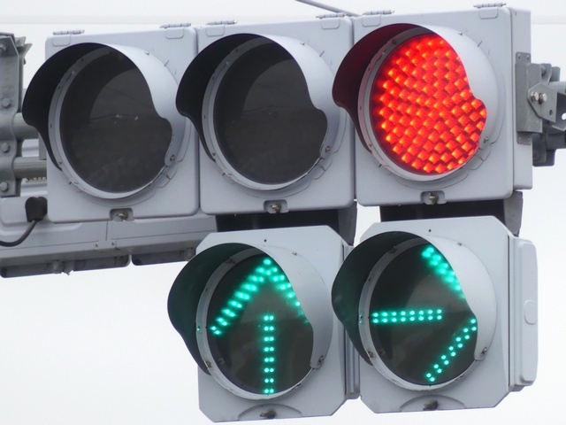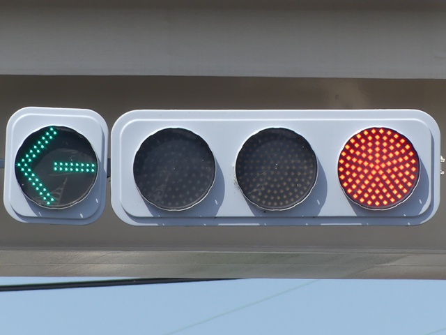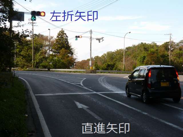 灯器がLED化された際、もともと左斜め矢印信号だったものが、左折矢印信号となりましたが、路面の道路標示「進行方向別通行区分」の矢印は直進であったため、信号機の規制と道路標示の規制が違っていました。