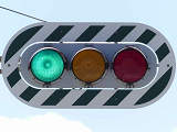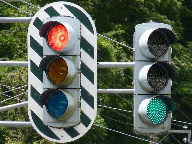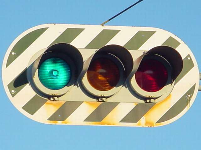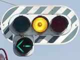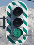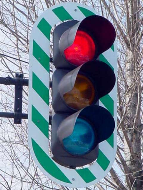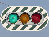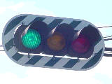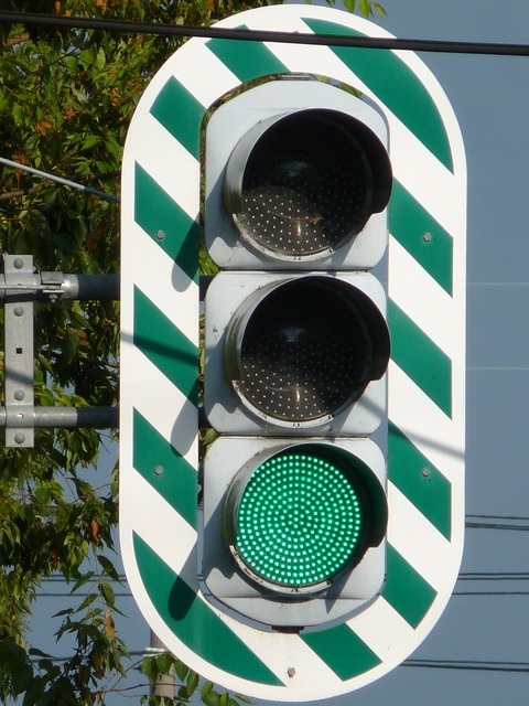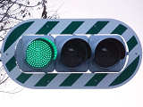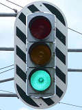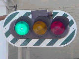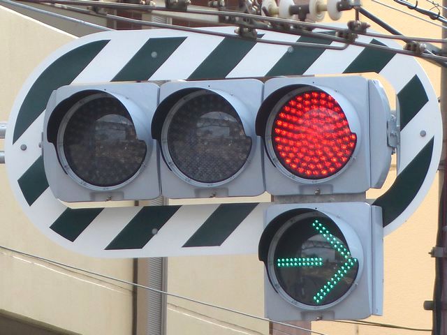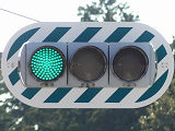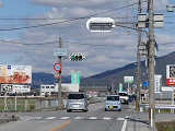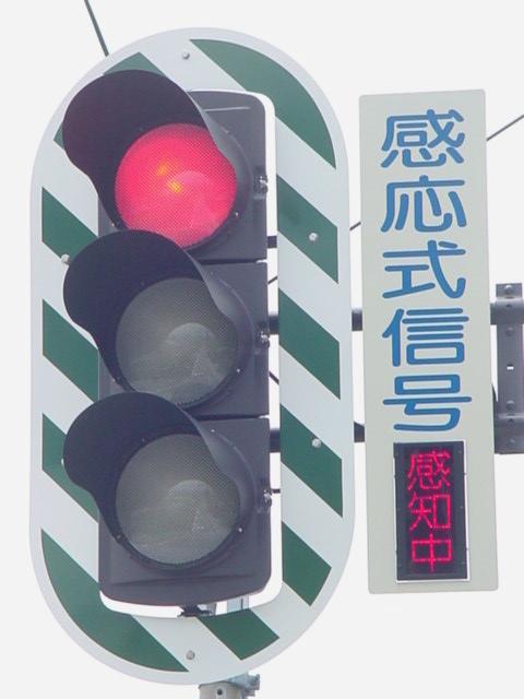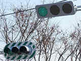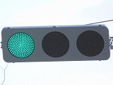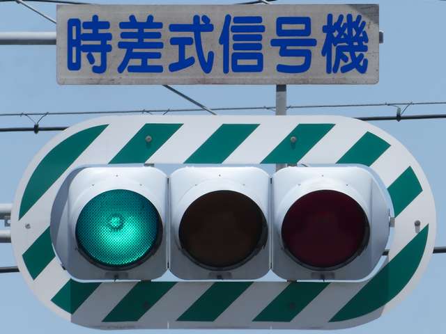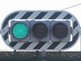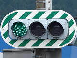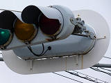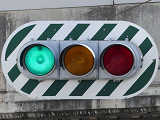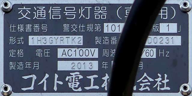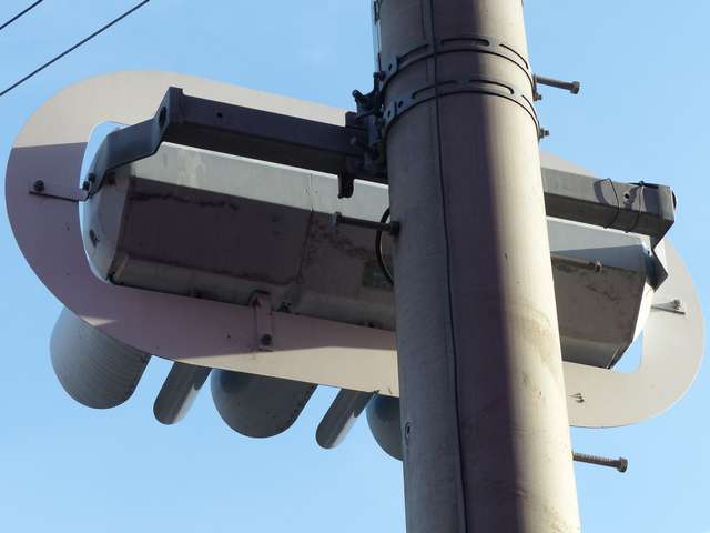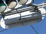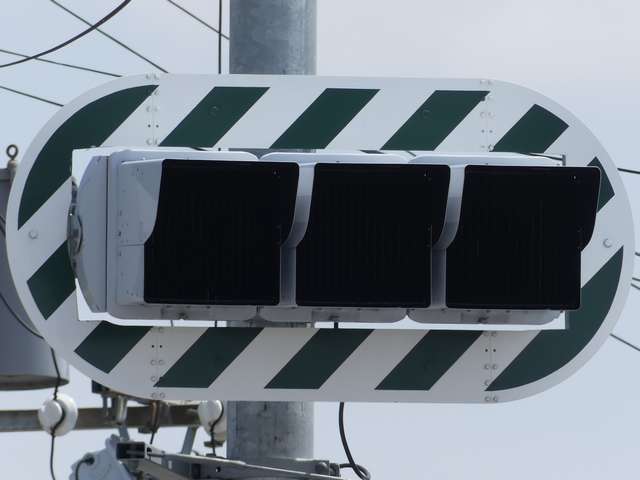 変則交差点の交通量の少ない道路に対して設置されている灯器で、灯器を強調させるために灯器に背面板が併設されています。
