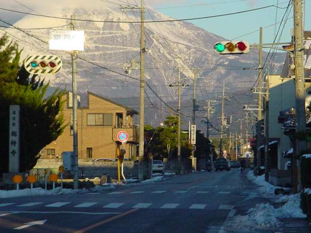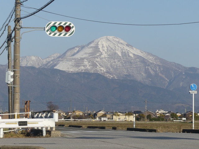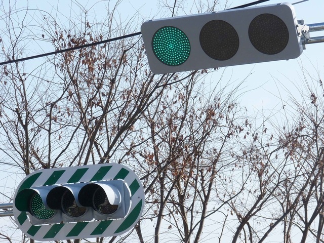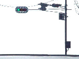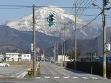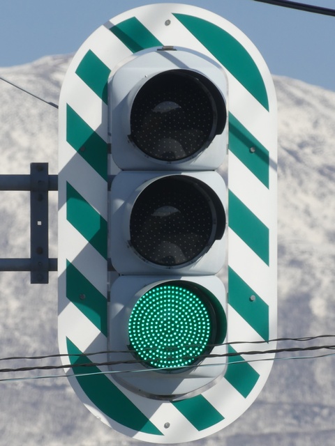 朝日の逆光の影響を受けやすく、また連続交差点である前方の交差点の信号を誤認しないよう背面板が設置されています。この交差点は、豪雪エリア外ですが、以前はなぜか豪雪型縦型で設置されていました。