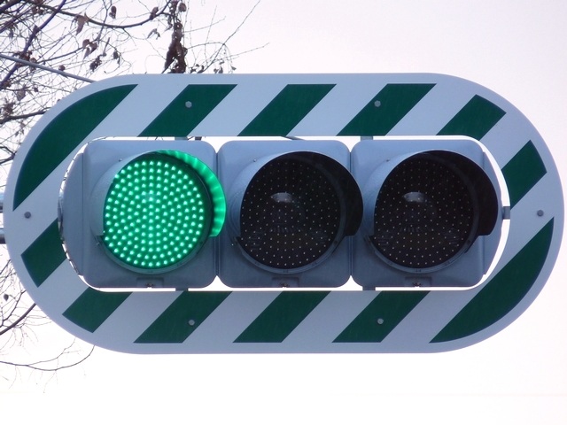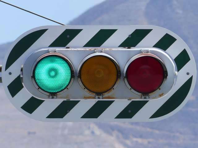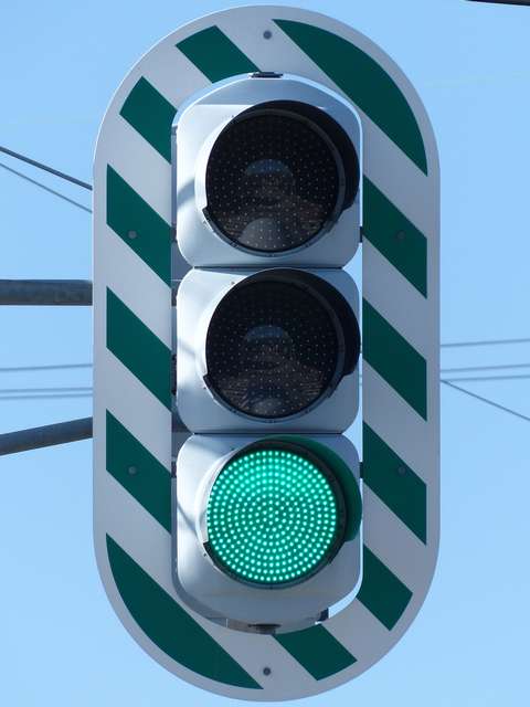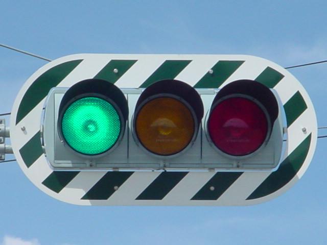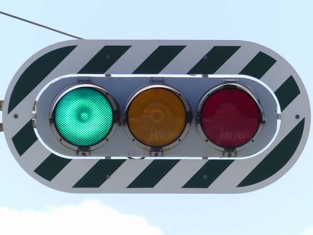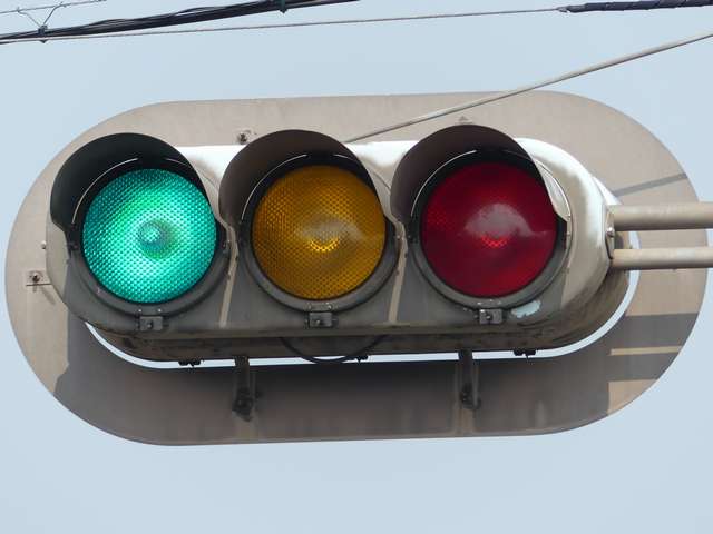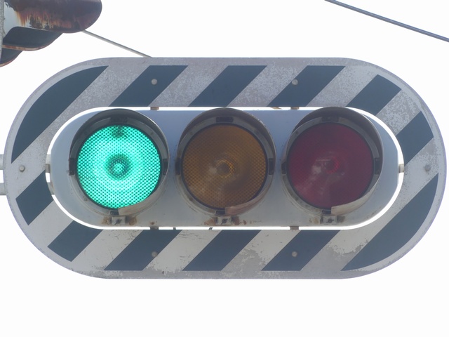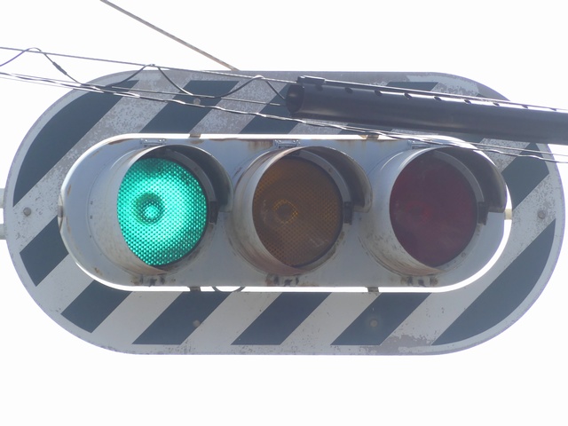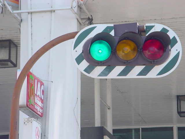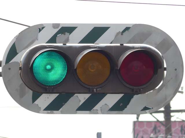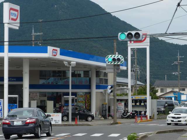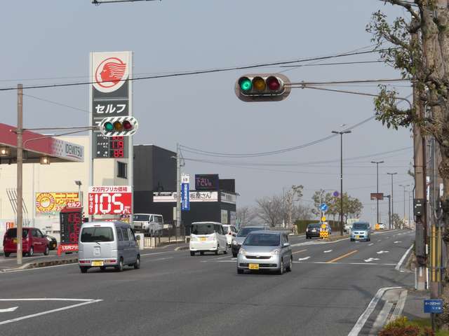 背景にガソリンスタンドがあるため、ガソリンスタンドの明かりで信号を見落とさないよう、灯器に背面板が併設されています。