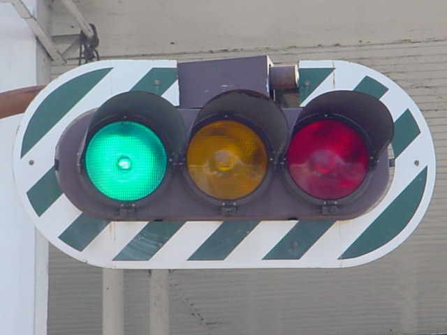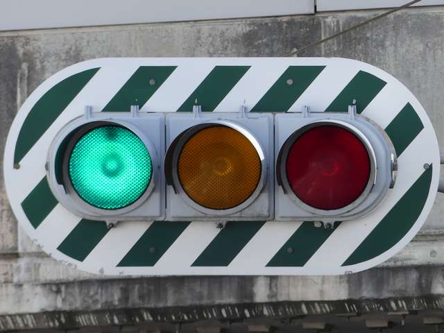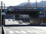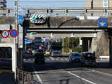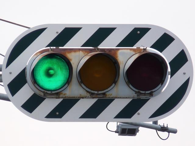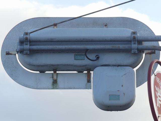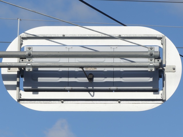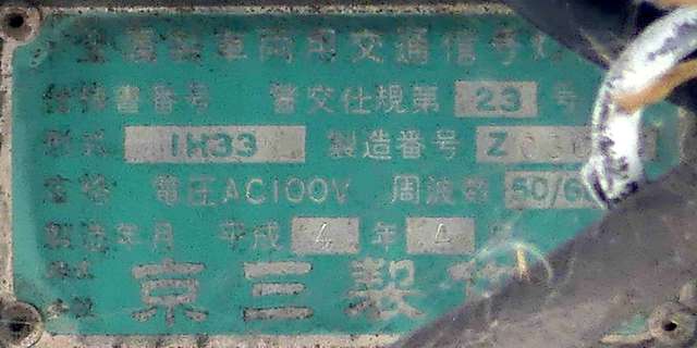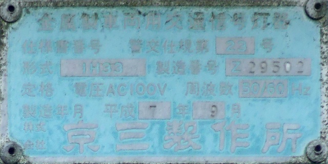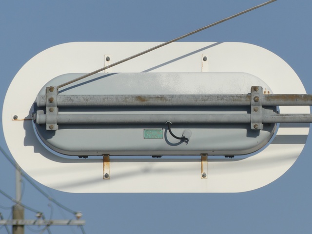 背景に陸橋の橋げたがあるので、灯器を目立たせるために、灯器に背面板を併設しています。