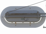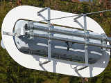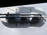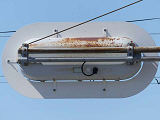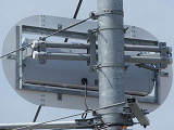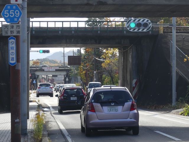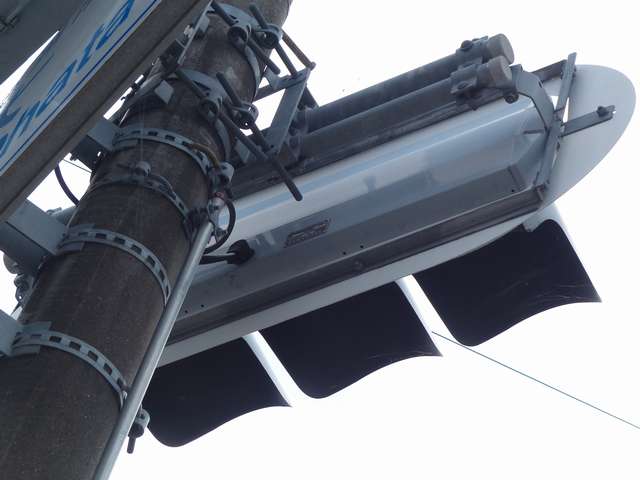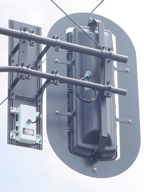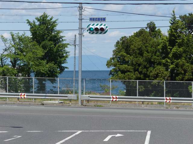 西進用灯器で、バックが琵琶湖のため、夕日の逆光の影響を受けやすいため、信号を見落とさないように灯器に背面板を併設しています。